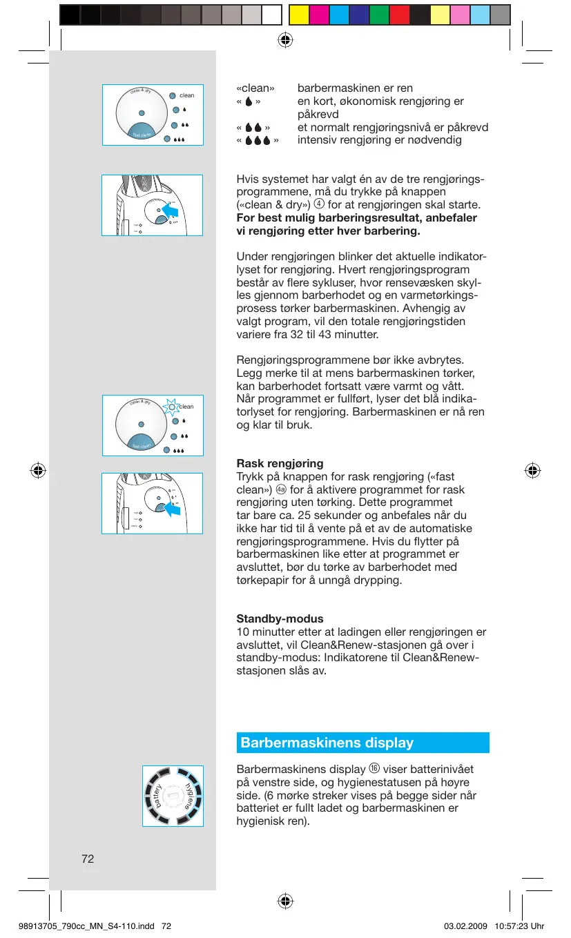 barbermaskinen er ren en kort, økonomisk rengjøring er påkrevd et normalt rengjøringsnivå er påkrevd intensiv rengjøring er nødvendig Hvis systemet har valgt én av de tre rengjøringsprogrammene, må du trykke på knappen («clean & dry») 4 for at rengjøringen skal starte. For best mulig barberingsresultat, anbefaler vi rengjøring etter hver barbering. clean