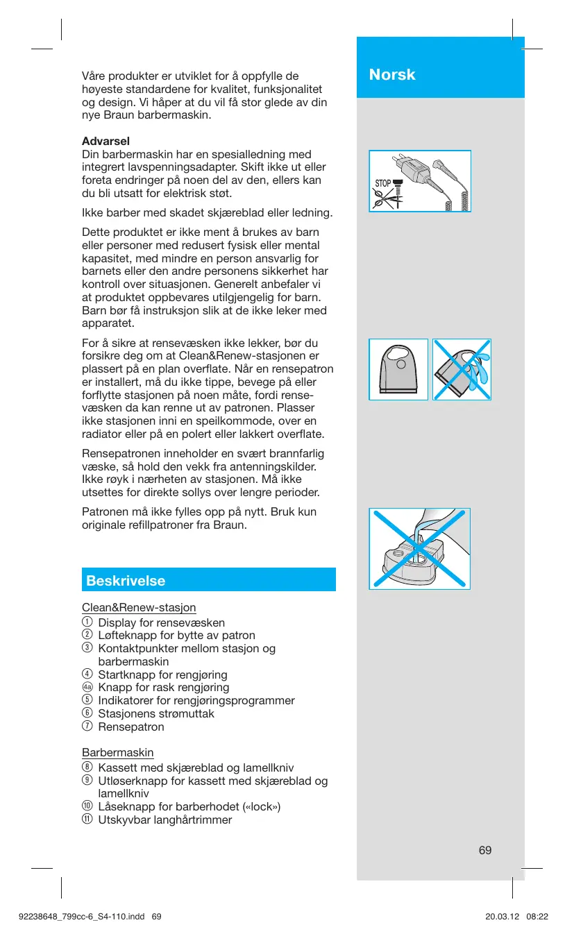 Våre produkter er utviklet for å oppfylle de høyeste standardene for kvalitet, funksjonalitet og design. Vi håper at du vil få stor glede av din nye Braun barbermaskin. Advarsel Din barbermaskin har en spesialledning med integrert lavspenningsadapter. Skift ikke ut eller foreta endringer på noen del av den, ellers kan du bli utsatt for elektrisk støt. Norsk STOP Ikke barber med skadet skjæreblad eller ledning. Dette produktet er ikke ment å brukes av barn eller personer med redusert fysisk eller mental kapasitet, med mindre en person ansvarlig for barnets eller den andre personens sikkerhet har kontroll over situasjonen. Generelt anbefaler vi at produktet oppbevares utilgjengelig for barn. Barn bør få instruksjon slik at de ikke leker med apparatet. For å sikre at rensevæsken ikke lekker, bør du forsikre deg om at Clean&Renew-stasjonen er plassert på en plan overflate. Når en rensepatron er installert, må du ikke tippe, bevege på eller forflytte stasjonen på noen måte, fordi rensevæsken da kan renne ut av patronen. Plasser ikke stasjonen inni en speilkommode, over en radiator eller på en polert eller lakkert overflate. Rensepatronen inneholder en svært brannfarlig væske, så hold den vekk fra antenningskilder. Ikke røyk i nærheten av stasjonen. Må ikke utsettes for direkte sollys over lengre perioder. Patronen må ikke fylles opp på nytt. Bruk kun originale refillpatroner fra Braun. Beskrivelse Clean&Renew-stasjon 1 Display for rensevæsken 2 Løfteknapp for bytte av patron 3 Kontaktpunkter mellom stasjon og barbermaskin 4 Startknapp for rengjøring D Knapp for rask rengjøring 5 Indikatorer for rengjøringsprogrammer 6 Stasjonens strømuttak 7 Rensepatron Barbermaskin Kassett med skjæreblad og lamellkniv Utløserknapp for kassett med skjæreblad og lamellkniv 0 Låseknapp for barberhodet («lock») q Utskyvbar langhårtrimmer