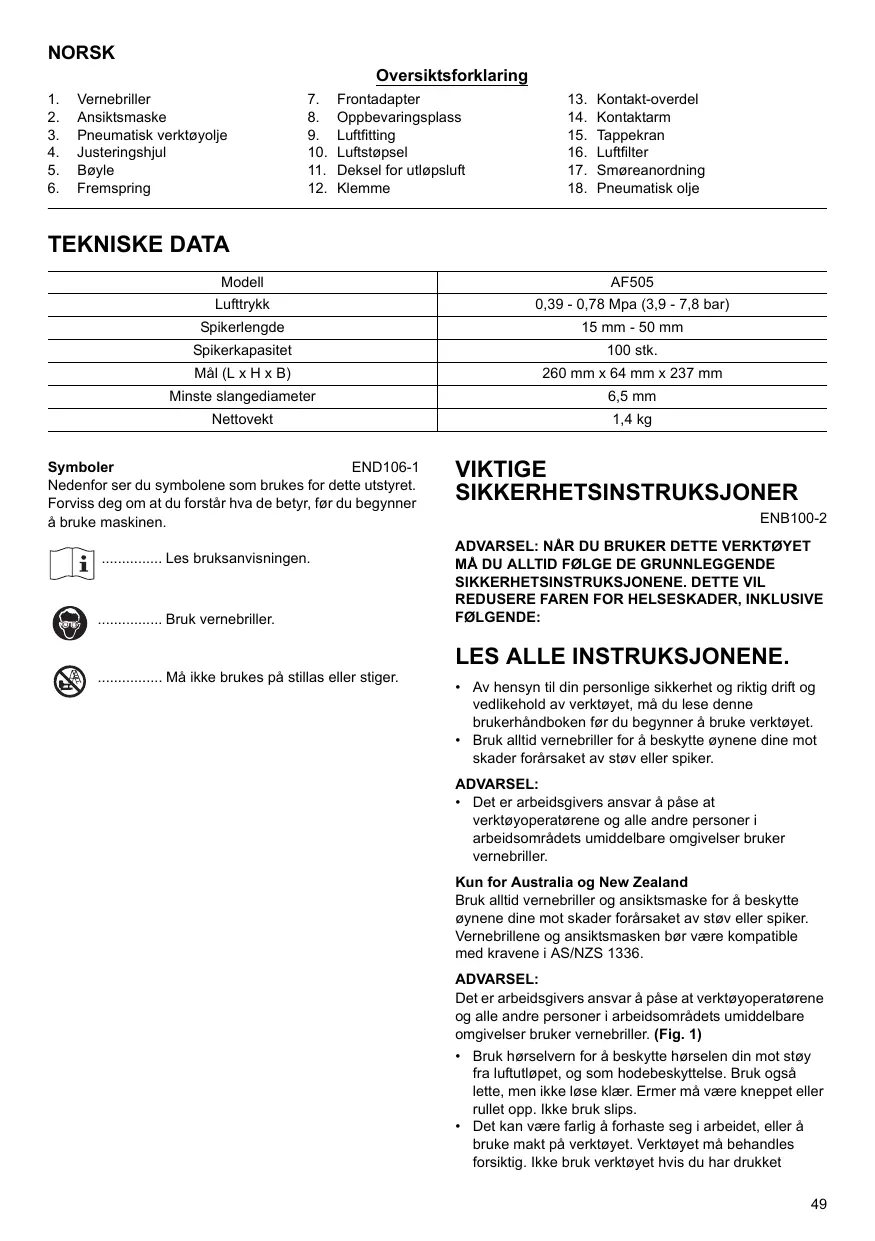 - När luftslangen er tilkoblet, mä du ikke verktøyet med fingeren på avtrekkeren, eller gi det til noen på denen maten. Utiliskitet avfyring av en spiker kan være uhyre farlig.