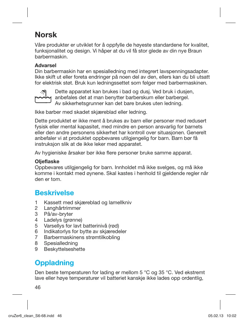 Norsk Våre produkter er utviklet for å oppfylle de høyeste standardene for kvalitet, funksjonalitet og design. Vi håper at du vil få stor glede av din nye Braun barbermaskin. Advarsel Din barbermaskin har en spesialledning med integrert lavspenningsadapter. Ikke skift ut eller foreta endringer på noen del av den, ellers kan du bli utsatt for elektrisk støt. Bruk kun ledningssettet som følger med barbermaskinen. Dette apparatet kan brukes i bad og dusj. Ved bruk i dusjen, anbefales det at man benytter barberskum eller barbergel. Av sikkerhetsgrunner kan det bare brukes uten ledning. Ikke barber med skadet skjæreblad eller ledning. Dette produktet er ikke ment å brukes av barn eller personer med redusert fysisk eller mental kapasitet, med mindre en person ansvarlig for barnets eller den andre personens sikkerhet har kontroll over situasjonen. Generelt anbefaler vi at produktet oppbevares utilgjengelig for barn. Barn bør få instruksjon slik at de ikke leker med apparatet. Av hygieniske årsaker bør ikke flere personer bruke samme apparat. Oljeflaske Oppbevares utilgjengelig for barn. Innholdet må ikke svelges, og må ikke komme i kontakt med øynene. Skal kastes i henhold til gjeldende regler når den er tom. Beskrivelse