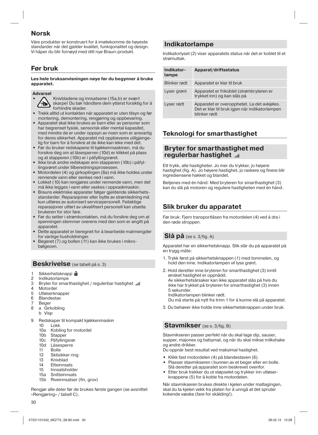 Norsk Våre produkter er konstruert for å imøtekomme de høyeste standarder når det gjelder kvalitet, funksjonalitet og design. Vi håper du blir fornøyd med ditt nye Braun-produkt. Før bruk Les hele bruksanvisningen nøye før du begynner å bruke apparatet. Advarsel Knivbladene og innsatsene (15a,b) er svært skarpe! Du bør håndtere dem ytterst forsiktig for å forhindre skader.
