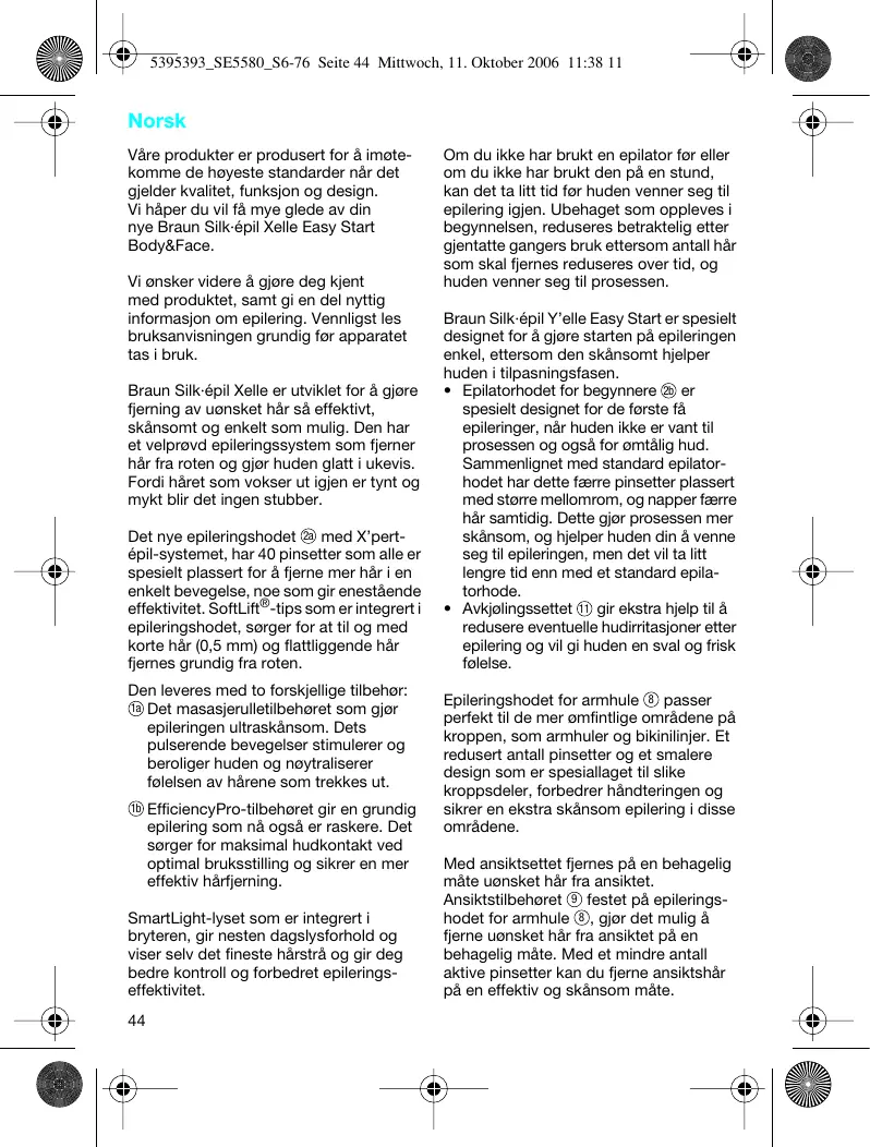 5395393_SE5580_S6-76 Seite 44 Mittwoch, 11. Oktober 2006 11:38 11 Norsk Våre produkter er produsert for å imøtekomme de høyeste standarder når det gjelder kvalitet, funksjon og design. Vi håper du vil få mye glede av din nye Braun Silk·épil Xelle Easy Start Body&Face. Vi ønsker videre å gjøre deg kjent med produktet, samt gi en del nyttig informasjon om epilering. Vennligst les bruksanvisningen grundig før apparatet tas i bruk. Braun Silk·épil Xelle er utviklet for å gjøre fjerning av uønsket hår så effektivt, skånsomt og enkelt som mulig. Den har et velprøvd epileringssystem som fjerner hår fra roten og gjør huden glatt i ukevis. Fordi håret som vokser ut igjen er tynt og mykt blir det ingen stubber. Det nye epileringshodet 2a med X’pertépil-systemet, har 40 pinsetter som alle er spesielt plassert for å fjerne mer hår i en enkelt bevegelse, noe som gir enestående effektivitet. SoftLift®-tips som er integrert i epileringshodet, sørger for at til og med korte hår (0,5 mm) og flattliggende hår fjernes grundig fra roten. Den leveres med to forskjellige tilbehør: 1a Det masasjerulletilbehøret som gjør epileringen ultraskånsom. Dets pulserende bevegelser stimulerer og beroliger huden og nøytraliserer følelsen av hårene som trekkes ut.
