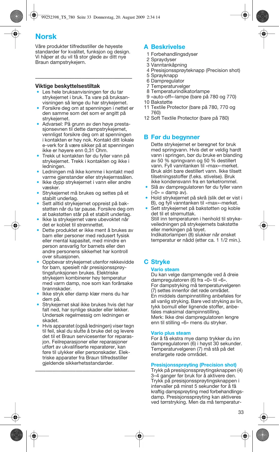 Våreproduktertilfredsstiller de høyeste standarder for kvalitet, funksjon og design. Vi haper at du vil få stor glede av ditt nye Braun dampstrykejern.