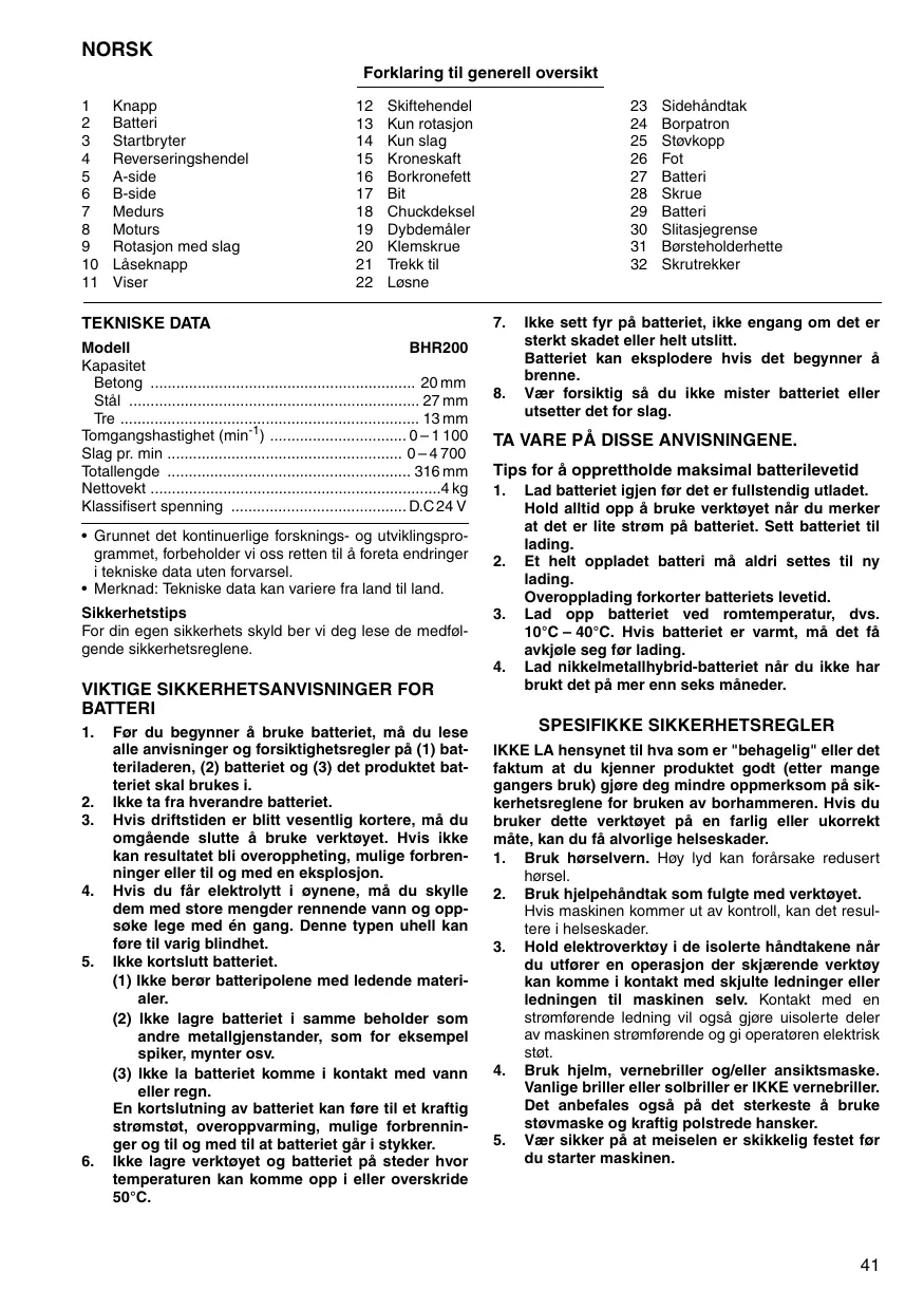 Nár verktóyet betjenes over hodehóyde er det viktig á pase at batteriet er skikkelig montert slik at det ilkke kan falle ut. Hvis ikke kan det ved et uhell falle ut og forársake skader på operaroren ell er eventuelle andre.