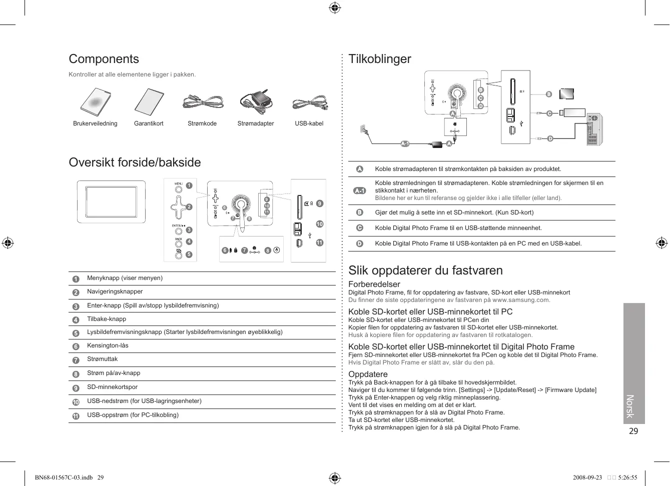 Menyknapp (viser menyen) Navigeringsknapper Enter-knapp (Spill av/stopp lysbildefremvisning) Tilbake-knapp Koble strømledningen til strømadapteren. Koble strømledningen for skjermen til en stikkontakt i nærheten. Bildene her er kun til referanse og gjelder ikke i alle tilfeller (eller land). Koble Digital Photo Frame til en USB-støttende minneenhet. Koble Digital Photo Frame til USB-kontakten på en PC med en USB-kabel. Slik oppdaterer du fastvaren Forberedelser Digital Photo Frame, fil for oppdatering av fastvare, SD-kort eller USB-minnekort Du finner de siste oppdateringene av fastvaren på www.samsung.com. Koble SD-kortet eller USB-minnekortet til PC Lysbildefremvisningsknapp (Starter lysbildefremvisningen øyeblikkelig) Koble SD-kortet eller USB-minnekortet til PCen din Kopier filen for oppdatering av fastvaren til SD-kortet eller USB-minnekortet. Husk å kopiere filen for oppdatering av fastvaren til rotkatalogen. Kensington-lås Koble SD-kortet eller USB-minnekortet til Digital Photo Frame Strømuttak Fjern SD-minnekortet eller USB-minnekortet fra PCen og koble det til Digital Photo Frame. Hvis Digital Photo Frame er slått av, slår du den på. Strøm på/av-knapp Oppdatere SD-minnekortspor USB-oppstrøm (for PC-tilkobling) BN68-01567C-03.indb 29 Norsk USB-nedstrøm (for USB-lagringsenheter) Trykk på Back-knappen for å gå tilbake til hovedskjermbildet. Naviger til du kommer til følgende trinn. [Settings] -> [Update/Reset] -> [Firmware Update] Trykk på Enter-knappen og velg riktig minneplassering. Vent til det vises en melding om at det er klart. Trykk på strømknappen for å slå av Digital Photo Frame. Ta ut SD-kortet eller USB-minnekortet. Trykk på strømknappen igjen for å slå på Digital Photo Frame.