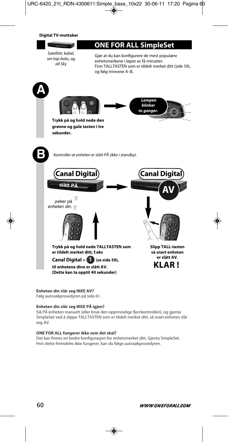 Téléchargez la notice de votre Universell fjernkontroll au format PDF gratuitement ! Retrouvez votre notice URC-6420 - ONE FOR ALL et reprennez votre appareil électronique en main. Sur cette page sont publiés tous les documents nécessaires à l'utilisation de votre appareil URC-6420 de la marque ONE FOR ALL.