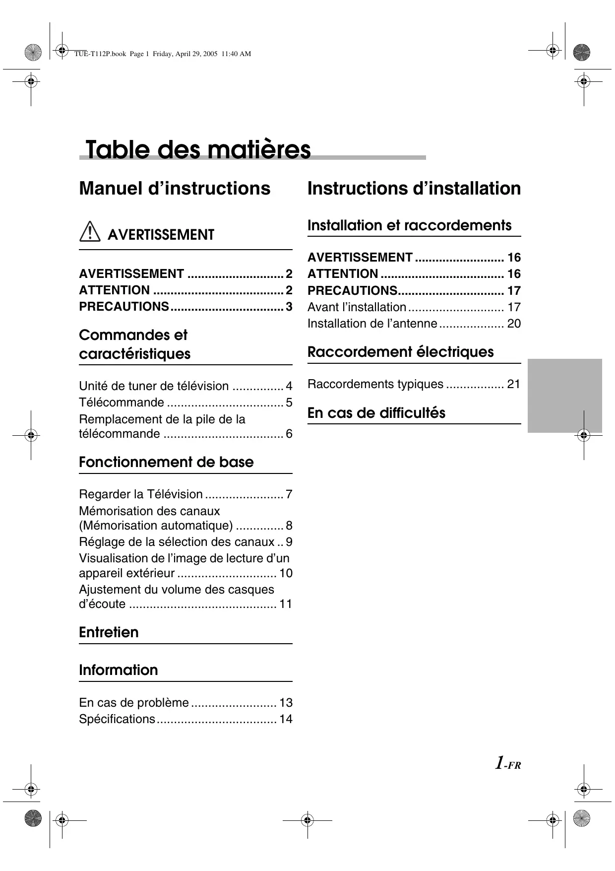 - TUE-T112P.book Page 1 Friday, April 29, 2005 11:40 AM Table des matières Manuel d’instructions AVERTISSEMENT AVERTISSEMENT p. 2