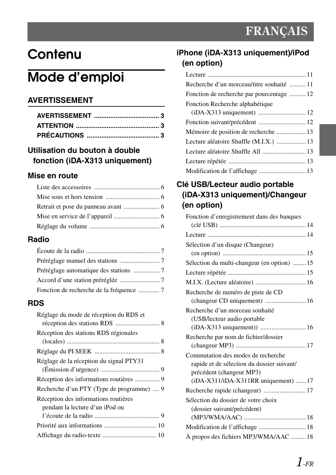 - iPhone (iDA-X313 uniquement)/iPod (en option) Lecture p. 11