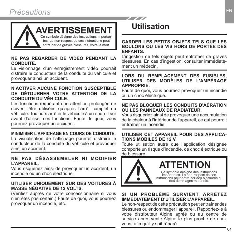 MASSE NÉGATIVE DE 12 VOLTS. (Vérifiez auprès de votre concessionnaire si vous n’en êtes pas certain.) Faute de quoi, vous pourriez provoquer un incendie, etc. Utilisation GARDER LES PETITS OBJETS TELS QUE LES BOULONS OU LES VIS HORS DE PORTÉE DES ENFANTS. L’ingestion de tels objets peut entraîner de graves blessures. En cas d’ingestion, consulter immédiatement un médecin. LORS DU REMPLACEMENT DES FUSIBLES, UTILISER DES MODÈLES DE L’AMPÉRAGE APPROPRIÉ. Faute de quoi, vous pourriez provoquer un incendie ou un choc électrique. NE PAS BLOQUER LES CONDUITS D'AÉRATION OU LES PANNEAUX DE RADIATEUR. Vous risqueriez ainsi de provoquer une accumulation de la chaleur à l'intérieur de l'appareil, ce qui pourrait entraîner un incendie. UTILISER CET APPAREIL POUR DES APPLICATIONS MOBILES DE 12 V. Toute utilisation autre que l’application désignée comporte un risque d’incendie, de choc électrique ou de blessure. ATTENTION Ce symbole désigne des instructions importantes. Le non-respect de ces instructions peut entraîner des blessures ou des dommages matériels. SI UN PROBLÈME SURVIENT, ARRÊTEZ IMMÉDIATEMENT D'UTILISER L'APPAREIL. Le non-respect de cette précaution peut entraîner des blessures ou endommager l’appareil. Rapportez-le à votre distributeur Alpine agréé ou au centre de service après-vente Alpine le plus proche de chez vous, afin qu'il y soit réparé.