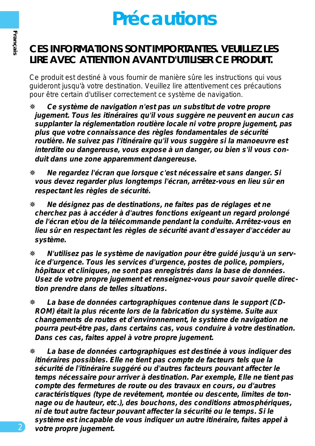 LIRE AVEC ATTENTION AVANT D'UTILISER CE PRODUIT. Ce produit est destiné à vous fournir de manière sûre les instructions qui vous guideront jusqu'à votre destination. Veuillez lire attentivement ces précautions pour être certain d'utiliser correctement ce système de navigation. Ce système de navigation n'est pas un substitut de votre propre jugement. Tous les itinéraires qu'il vous suggère ne peuvent en aucun cas supplanter la réglementation routière locale ni votre propre jugement, pas plus que votre connaissance des règles fondamentales de sécurité routière. Ne suivez pas l'itinéraire qu'il vous suggère si la manoeuvre est interdite ou dangereuse, vous expose à un danger, ou bien s'il vous conduit dans une zone apparemment dangereuse. Ne regardez l'écran que lorsque c'est nécessaire et sans danger. Si vous devez regarder plus longtemps l'écran, arrêtez-vous en lieu sûr en respectant les règles de sécurité. Ne désignez pas de destinations, ne faites pas de réglages et ne cherchez pas à accéder à d'autres fonctions exigeant un regard prolongé de l'écran et/ou de la télécommande pendant la conduite. Arrêtez-vous en lieu sûr en respectant les règles de sécurité avant d'essayer d'accéder au système. N'utilisez pas le système de navigation pour être guidé jusqu'à un service d'urgence. Tous les services d'urgence, postes de police, pompiers, hôpitaux et cliniques, ne sont pas enregistrés dans la base de données. Usez de votre propre jugement et renseignez-vous pour savoir quelle direction prendre dans de telles situations. La base de données cartographiques contenue dans le support (CDROM) était la plus récente lors de la fabrication du système. Suite aux changements de routes et d'environnement, le système de navigation ne pourra peut-être pas, dans certains cas, vous conduire à votre destination. Dans ces cas, faites appel à votre propre jugement. La base de données cartographiques est destinée à vous indiquer des itinéraires possibles. Elle ne tient pas compte de facteurs tels que la sécurité de l'itinéraire suggéré ou d'autres facteurs pouvant affecter le temps nécessaire pour arriver à destination. Par exemple, Elle ne tient pas compte des fermetures de route ou des travaux en cours, ou d'autres caractéristiques (type de revêtement, montée ou descente, limites de tonnage ou de hauteur, etc.), des bouchons, des conditions atmosphériques, ni de tout autre facteur pouvant affecter la sécurité ou le temps. Si le système est incapable de vous indiquer un autre itinéraire, faites appel à 2 votre propre jugement.