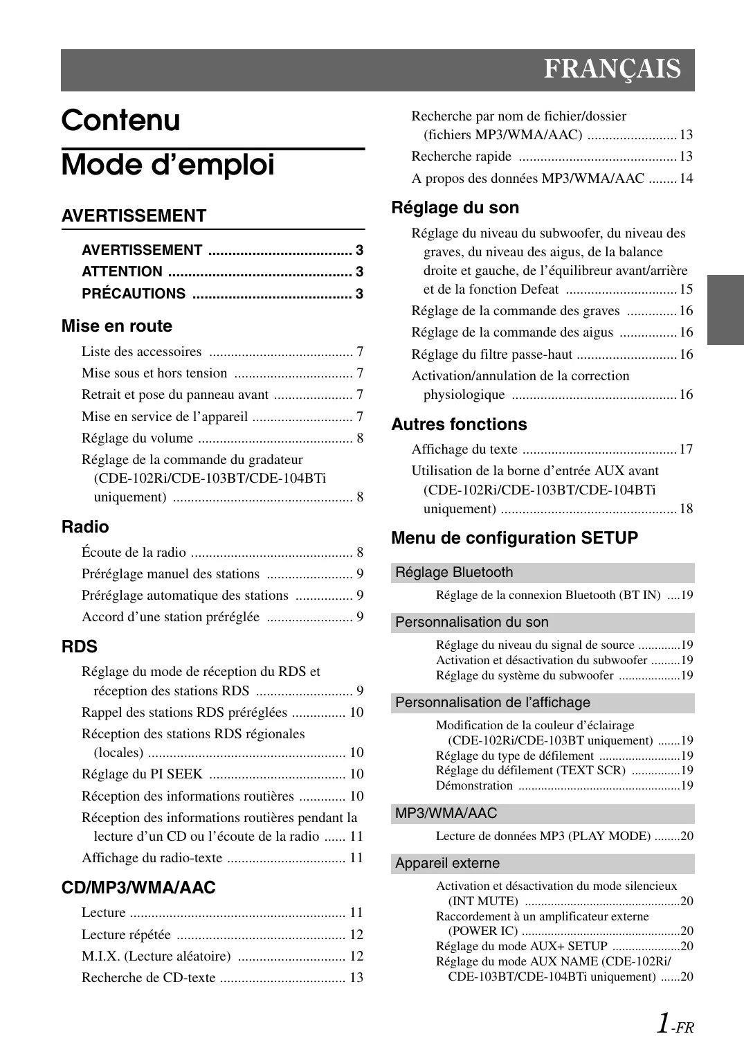 - CDE-104BTi uniquement) Configuration avant utilisation p. 21