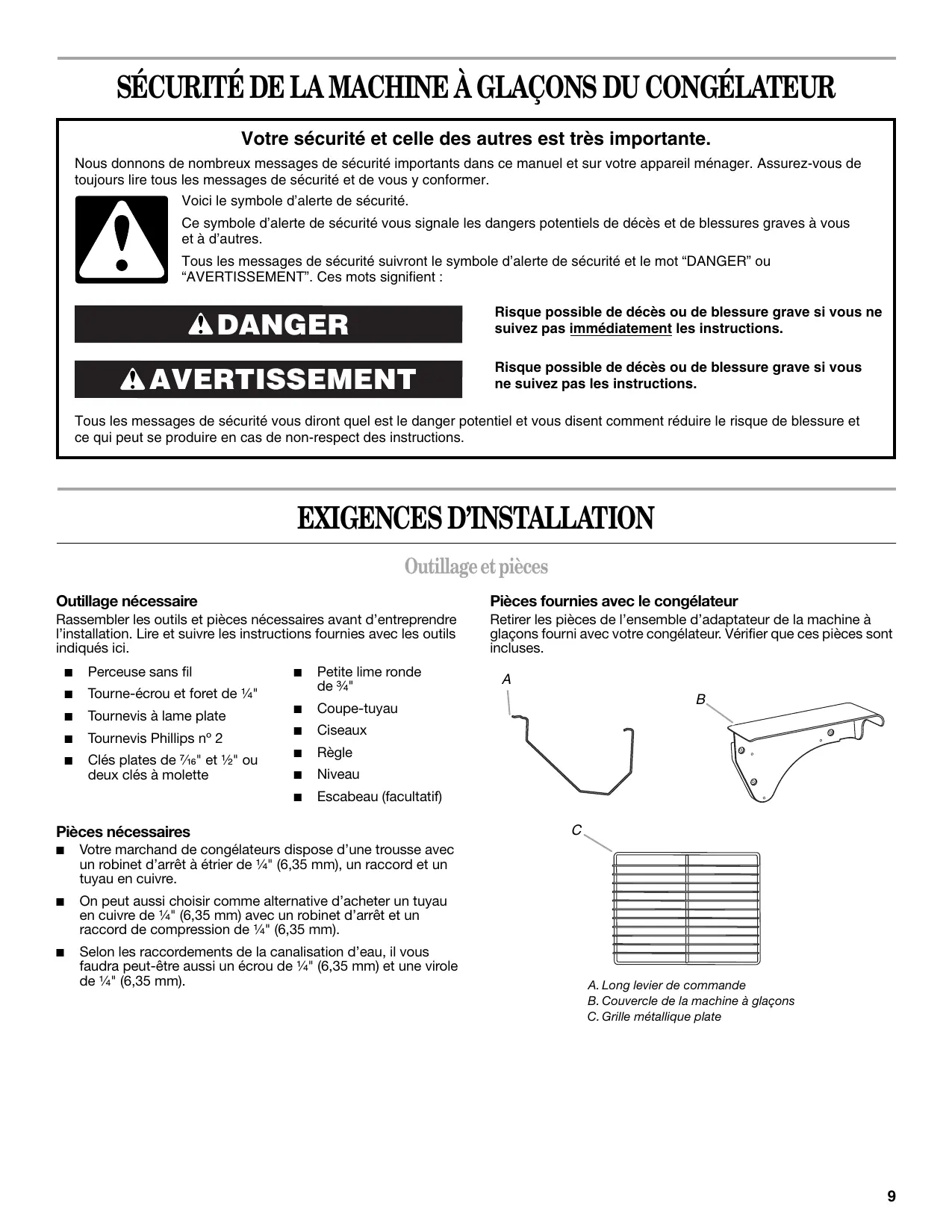 SÉCURITÉ DE LA MACHINE À GLAÇONS DU CONGÉLATEUR Votre sécurité et celle des autres est très importante. Nous donnons de nombreux messages de sécurité importants dans ce manuel et sur votre appareil ménager. Assurez-vous de toujours lire tous les messages de sécurité et de vous y conformer. Voici le symbole d’alerte de sécurité. Ce symbole d’alerte de sécurité vous signale les dangers potentiels de décès et de blessures graves à vous et à d’autres. Tous les messages de sécurité suivront le symbole d’alerte de sécurité et le mot “DANGER” ou “AVERTISSEMENT”. Ces mots signifient : Risque possible de décès ou de blessure grave si vous ne suivez pas immédiatement les instructions. DANGER AVERTISSEMENT Risque possible de décès ou de blessure grave si vous ne suivez pas les instructions. Tous les messages de sécurité vous diront quel est le danger potentiel et vous disent comment réduire le risque de blessure et ce qui peut se produire en cas de non-respect des instructions.