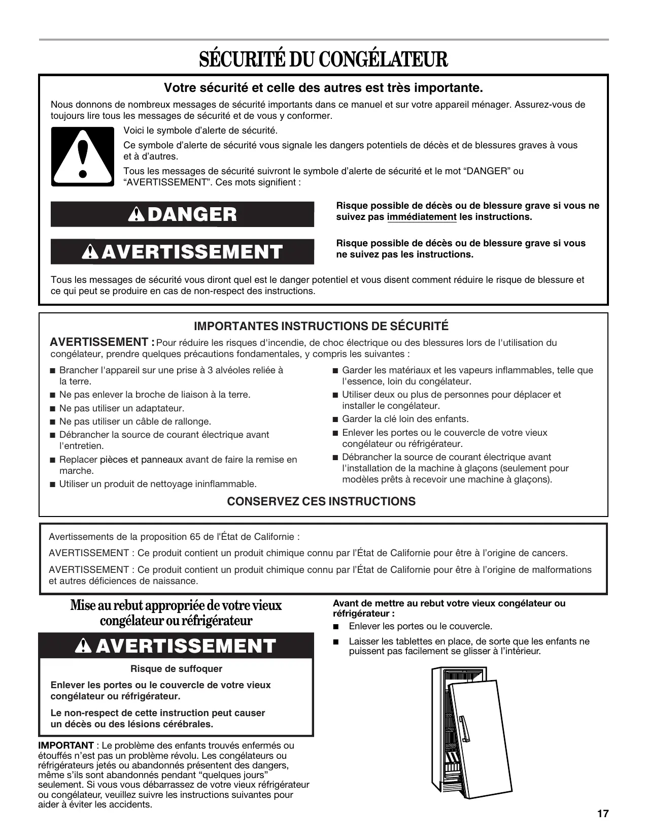 AVERTISSEMENT : Ce produit contient un produit chimique connu par l’État de Californie pour être à l’origine de malformations et autres déficiences de naissance. Mise au rebut appropriée de votre vieux congélateur ou réfrigérateur AVERTISSEMENT Avant de mettre au rebut votre vieux congélateur ou réfrigérateur : ■ Enlever les portes ou le couvercle.