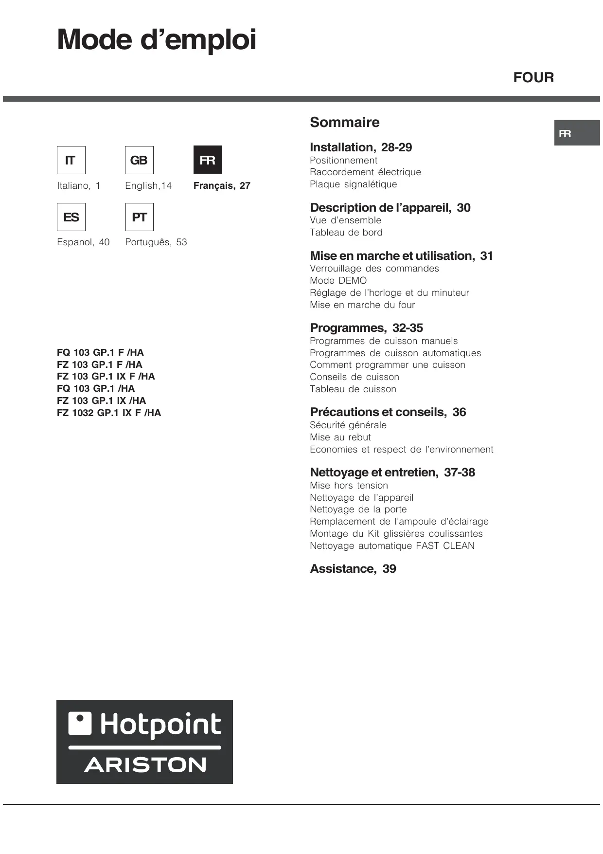Retrouvez gratuitement la notice de l'appareil FZ 103 GP.1 IX F /HA HOTPOINT-ARISTON au format PDF.