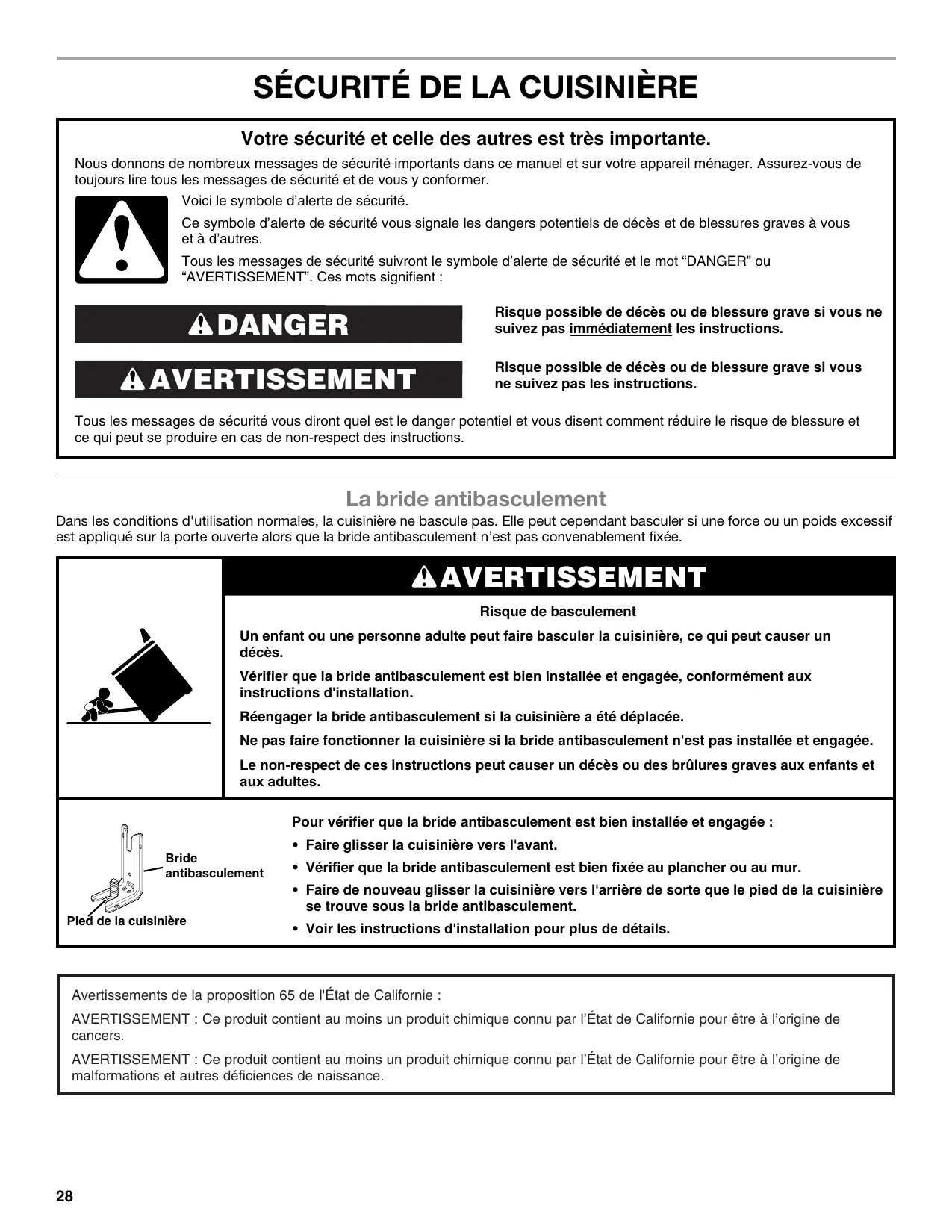 AVERTISSEMENT Risque de basculement Un enfant ou une personne adulte peut faire basculer la cuisinière, ce qui peut causer un décès. Vérifier que la bride antibasculement est bien installée et engagée, conformément aux instructions d'installation. Réengager la bride antibasculement si la cuisinière a été déplacée. Ne pas faire fonctionner la cuisinière si la bride antibasculement n'est pas installée et engagée. Le non-respect de ces instructions peut causer un décès ou des brûlures graves aux enfants et aux adultes. Pour vérifier que la bride antibasculement est bien installée et engagée : • Faire glisser la cuisinière vers l'avant. Bride antibasculement