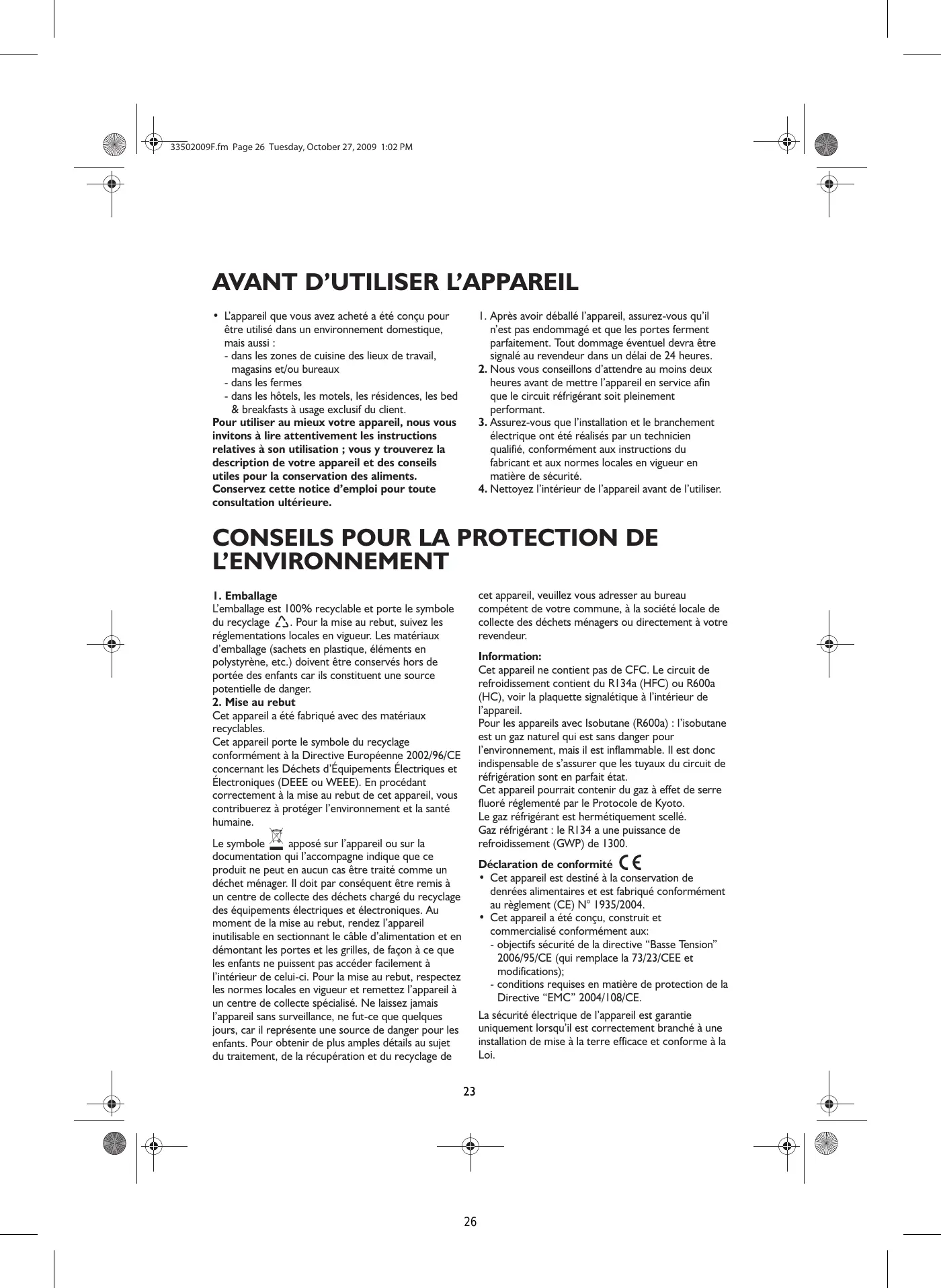 Cet appareil a été fabriqué avec des matériaux recyclables. Cet appareil porte le symbole du recyclage conformément à la Directive Européenne 2002/96/CE concernant les Déchets d’Équipements Électriques et Électroniques (DEEE ou WEEE). En procédant correctement à la mise au rebut de cet appareil, vous contribuerez à protéger l’environnement et la santé humaine. Information: Cet appareil ne contient pas de CFC. Le circuit de refroidissement contient du R134a (HFC) ou R600a (HC), voir la plaquette signalétique à l’intérieur de l’appareil. Pour les appareils avec Isobutane (R600a) : l’isobutane est un gaz naturel qui est sans danger pour l’environnement, mais il est inflammable. Il est donc indispensable de s’assurer que les tuyaux du circuit de réfrigération sont en parfait état. Cet appareil pourrait contenir du gaz à effet de serre fluoré réglementé par le Protocole de Kyoto. Le gaz réfrigérant est hermétiquement scellé. Gaz réfrigérant : le R134 a une puissance de refroidissement (GWP) de 1300. Le symbole apposé sur l’appareil ou sur la documentation qui l’accompagne indique que ce produit ne peut en aucun cas être traité comme un déchet ménager. Il doit par conséquent être remis à un centre de collecte des déchets chargé du recyclage des équipements électriques et électroniques. Au moment de la mise au rebut, rendez l’appareil inutilisable en sectionnant le câble d’alimentation et en démontant les portes et les grilles, de façon à ce que les enfants ne puissent pas accéder facilement à l’intérieur de celui-ci. Pour la mise au rebut, respectez les normes locales en vigueur et remettez l’appareil à un centre de collecte spécialisé. Ne laissez jamais l’appareil sans surveillance, ne fut-ce que quelques jours, car il représente une source de danger pour les enfants. Pour obtenir de plus amples détails au sujet du traitement, de la récupération et du recyclage de Déclaration de conformité