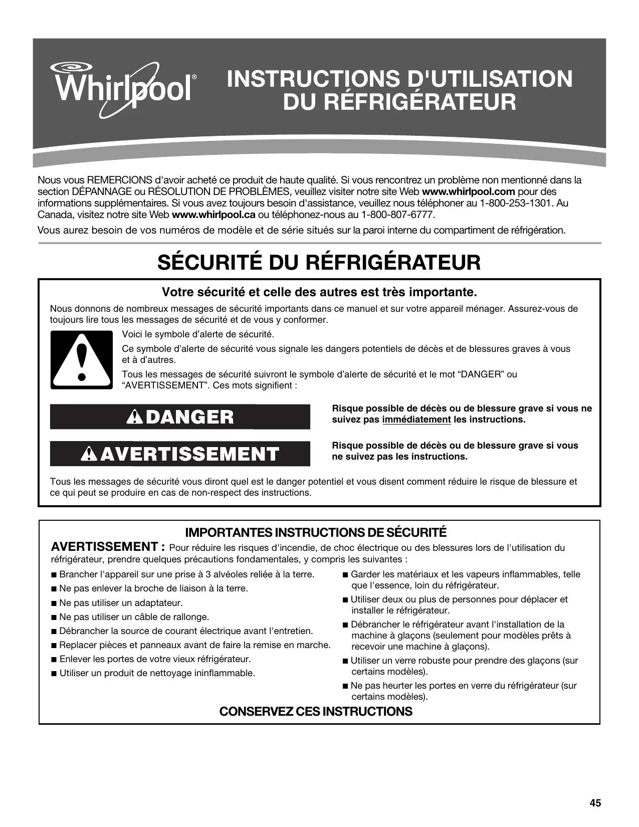 Nous vous REMERCIONS d'avoir acheté ce produit de haute qualité. Si vous rencontrez un problème non mentionné dans la section DÉPANNAGE ou RÉSOLUTION DE PROBLÈMES, veuillez visiter notre site Web www.whirlpool.com pour des informations supplémentaires. Si vous avez toujours besoin d'assistance, veuillez nous téléphoner au 1-800-253-1301. Au Canada, visitez notre site Web www.whirlpool.ca ou téléphonez-nous au 1-800-807-6777. Vous aurez besoin de vos numéros de modèle et de série situés sur la paroi interne du compartiment de réfrigération.