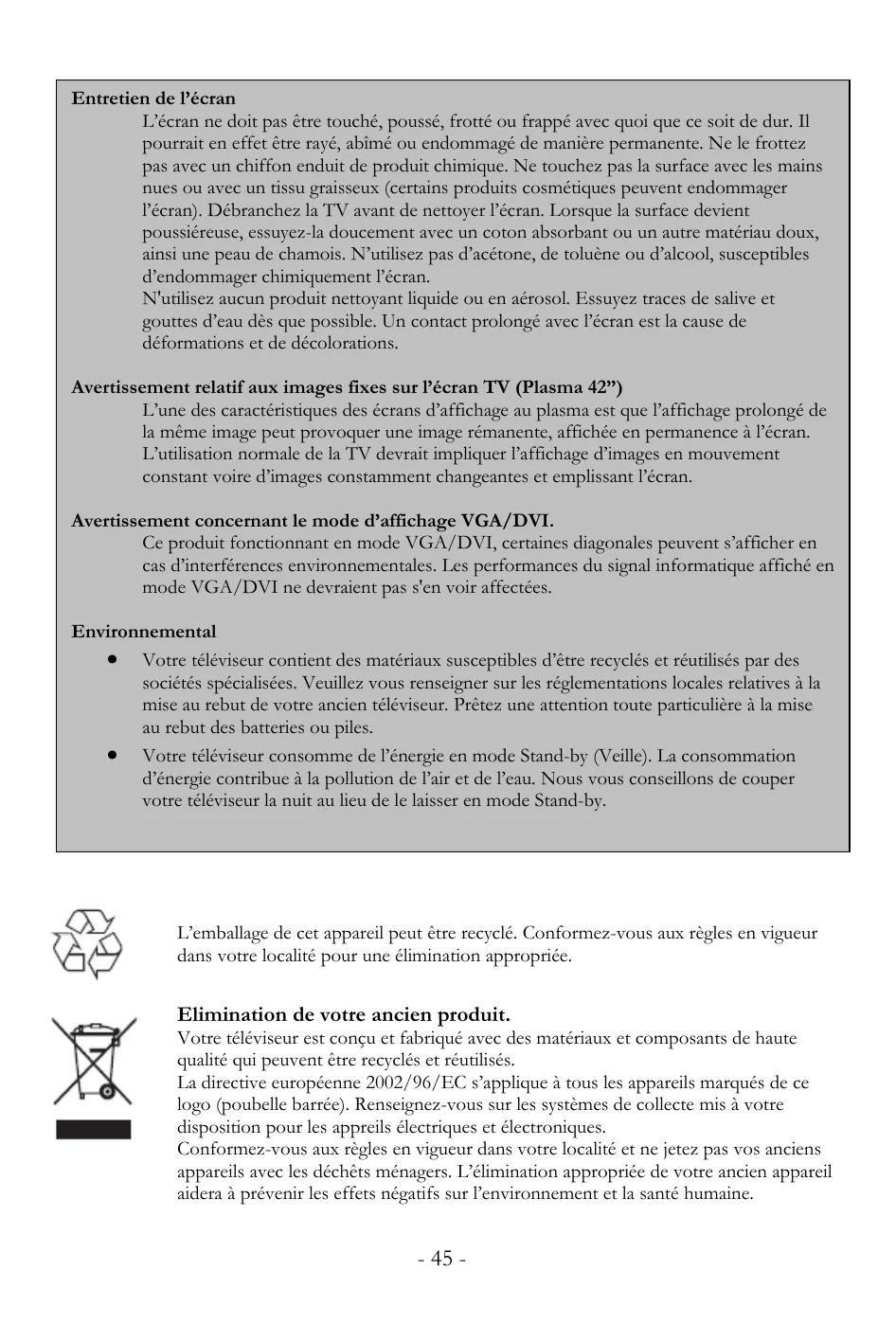 Entretien de l’écran L’écran ne doit pas être touché, poussé, frotté ou frappé avec quoi que ce soit de dur. Il pourrait en effet être rayé, abîmé ou endommagé de manière permanente. Ne le frottez pas avec un chiffon enduit de produit chimique. Ne touchez pas la surface avec les mains nues ou avec un tissu graisseux (certains produits cosmétiques peuvent endommager l’écran). Débranchez la TV avant de nettoyer l’écran. Lorsque la surface devient poussiéreuse, essuyez-la doucement avec un coton absorbant ou un autre matériau doux, ainsi une peau de chamois. N’utilisez pas d’acétone, de toluène ou d’alcool, susceptibles d’endommager chimiquement l’écran. N'utilisez aucun produit nettoyant liquide ou en aérosol. Essuyez traces de salive et gouttes d’eau dès que possible. Un contact prolongé avec l’écran est la cause de déformations et de décolorations. Avertissement relatif aux images fixes sur l’écran TV (Plasma 42”) L’une des caractéristiques des écrans d’affichage au plasma est que l’affichage prolongé de la même image peut provoquer une image rémanente, affichée en permanence à l’écran. L’utilisation normale de la TV devrait impliquer l’affichage d’images en mouvement constant voire d’images constamment changeantes et emplissant l’écran. Avertissement concernant le mode d’affichage VGA/DVI. Ce produit fonctionnant en mode VGA/DVI, certaines diagonales peuvent s’afficher en cas d’interférences environnementales. Les performances du signal informatique affiché en mode VGA/DVI ne devraient pas s'en voir affectées. Environnemental