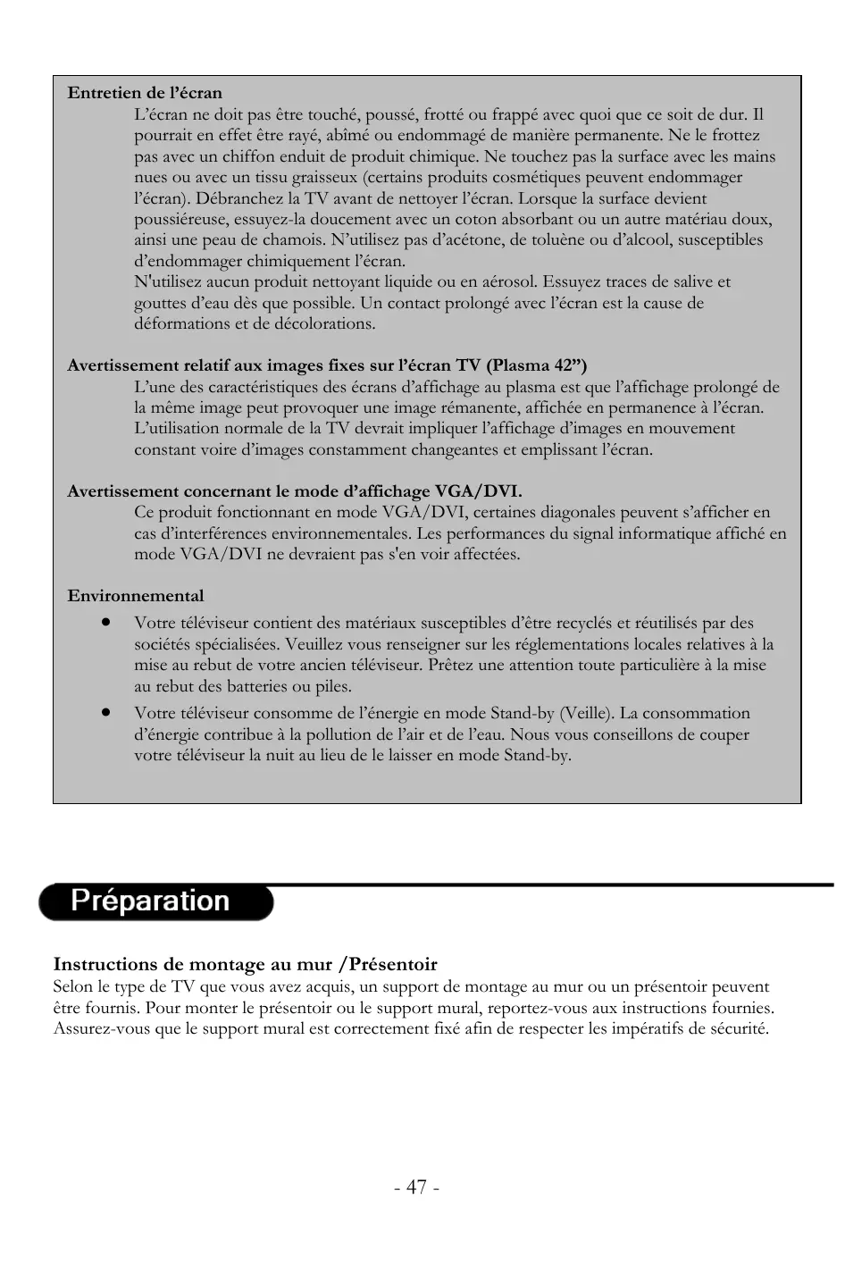 Entretien de l’écran L’écran ne doit pas être touché, poussé, frotté ou frappé avec quoi que ce soit de dur. Il pourrait en effet être rayé, abîmé ou endommagé de manière permanente. Ne le frottez pas avec un chiffon enduit de produit chimique. Ne touchez pas la surface avec les mains nues ou avec un tissu graisseux (certains produits cosmétiques peuvent endommager l’écran). Débranchez la TV avant de nettoyer l’écran. Lorsque la surface devient poussiéreuse, essuyez-la doucement avec un coton absorbant ou un autre matériau doux, ainsi une peau de chamois. N’utilisez pas d’acétone, de toluène ou d’alcool, susceptibles d’endommager chimiquement l’écran. N'utilisez aucun produit nettoyant liquide ou en aérosol. Essuyez traces de salive et gouttes d’eau dès que possible. Un contact prolongé avec l’écran est la cause de déformations et de décolorations. Avertissement relatif aux images fixes sur l’écran TV (Plasma 42”) L’une des caractéristiques des écrans d’affichage au plasma est que l’affichage prolongé de la même image peut provoquer une image rémanente, affichée en permanence à l’écran. L’utilisation normale de la TV devrait impliquer l’affichage d’images en mouvement constant voire d’images constamment changeantes et emplissant l’écran. Avertissement concernant le mode d’affichage VGA/DVI. Ce produit fonctionnant en mode VGA/DVI, certaines diagonales peuvent s’afficher en cas d’interférences environnementales. Les performances du signal informatique affiché en mode VGA/DVI ne devraient pas s'en voir affectées. Environnemental • Votre téléviseur contient des matériaux susceptibles d’être recyclés et réutilisés par des sociétés spécialisées. Veuillez vous renseigner sur les réglementations locales relatives à la mise au rebut de votre ancien téléviseur. Prêtez une attention toute particulière à la mise au rebut des batteries ou piles. • Votre téléviseur consomme de l’énergie en mode Stand-by (Veille). La consommation d’énergie contribue à la pollution de l’air et de l’eau. Nous vous conseillons de couper votre téléviseur la nuit au lieu de le laisser en mode Stand-by.