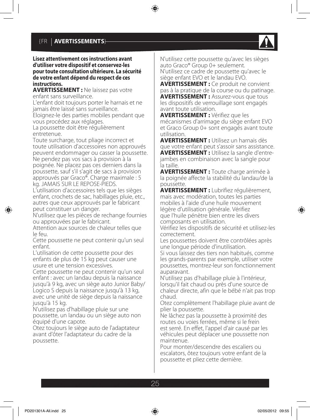 N'utilisez ce cadre de poussette qu'avec le siège enfant EVO et le landau EVO. AVERTISSEMENT : Ce produit ne convient pas à la pratique de la course ou du patinage. AVERTISSEMENT : Assurez-vous que tous les dispositifs de verrouillage sont engagés avant toute utilisation. AVERTISSEMENT : Vérifiez que les mécanismes d'arrimage du siège enfant EVO et Graco Group 0+ sont engagés avant toute utilisation. AVERTISSEMENT : Utilisez un harnais dès que votre enfant peut s'assoir sans assistance. AVERTISSEMENT : Utilisez la sangle d'entrejambes en combinaison avec la sangle pour la taille. AVERTISSEMENT : Toute charge arrimée à la poignée affecte la stabilité du landau/de la poussette. AVERTISSEMENT : Lubrifiez régulièrement, mais avec modération, toutes les parties mobiles à l'aide d'une huile mouvement légère d'utilisation générale. Vérifiez que l'huile pénètre bien entre les divers composants en utilisation. Vérifiez les dispositifs de sécurité et utilisez-les correctement. Les poussettes doivent être contrôlées après une longue période d'inutilisation. Si vous laissez des tiers non habitués, comme les grands-parents par exemple, utiliser votre poussettes, montrez-leur son fonctionnement auparavant. N'utilisez pas d'habillage pluie à l'intérieur, lorsqu'il fait chaud ou près d'une source de chaleur directe, afin que le bébé n'ait pas trop chaud. Otez complètement l'habillage pluie avant de plier la poussette. Ne lâchez pas la poussette à proximité des routes ou voies ferrées, même si le frein est serré. En effet, l'appel d'air causé par les véhicules peut déplacer une poussette non maintenue. Pour monter/descendre des escaliers ou escalators, ôtez toujours votre enfant de la poussette et pliez cette dernière.