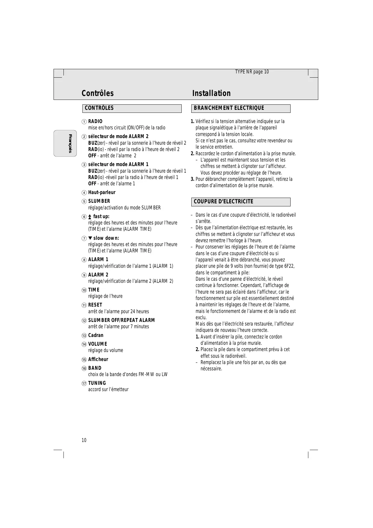 2 sélecteur de mode ALARM 2 Si ce n’est pas le cas, consultez votre revendeur ou BUZ(zer) - réveil par la sonnerie à l’heure de réveil 2 le service entretien. RAD(io) - réveil par la radio à l’heure de réveil 2 2. Raccordez le cordon d’alimentation à la prise murale. OFF - arrêt de l’alarme 2 – L’appareil est maintenant sous tension et les 3 sélecteur de mode ALARM 1 chiffres se mettent à clignoter sur l’afficheur. BUZ(zer) - réveil par la sonnerie à l’heure de réveil 1 Vous devez procéder au réglage de l’heure. RAD(io) -réveil par la radio à l’heure de réveil 1 3. Pour débrancher complètement l’appareil, retirez la OFF - arrêt de l’alarme 1 cordon d’alimentation de la prise murale. 4 Haut-parleur 5 SLUMBER réglage/activation du mode SLUMBER 6 7 fast up: réglage des heures et des minutes pour l’heure (TIME) et l’alarme (ALARM TIME) 7 4 slow down: réglage des heures et des minutes pour l’heure (TIME) et l’alarme (ALARM TIME) 8 ALARM 1 réglage/vérification de l’alarme 1 (ALARM 1) 9 ALARM 2 réglage/vérification de l’alarme 2 (ALARM 2) 0 TIME réglage de l’heure ! RESET arrêt de l’alarme pour 24 heures @ SLUMBER OFF/REPEAT ALARM arrêt de l’alarme pour 7 minutes # Cadran $ VOLUME réglage du volume % Afficheur ^ BAND choix de la bande d’ondes FM-MW ou LW & TUNING accord sur l’émetteur