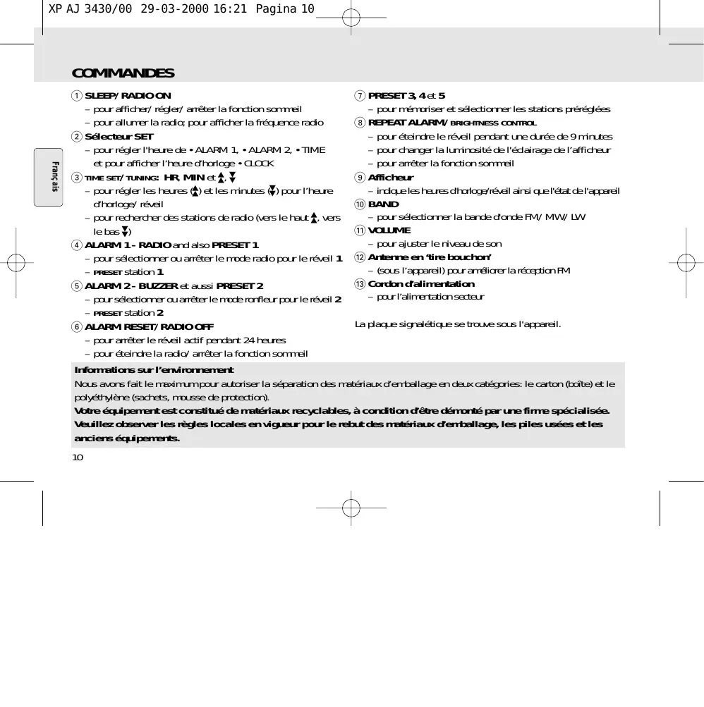 1 SLEEP/ RADIO ON 7 PRESET 3, 4 et 5 – pour afficher/ régler/ arrêter la fonction sommeil – pour mémoriser et sélectionner les stations préréglées – pour allumer la radio; pour afficher la fréquence radio 8 REPEAT ALARM/ BRIGHTNESS CONTROL 2 Sélecteur SET – pour éteindre le réveil pendant une durée de 9 minutes – pour régler l'heure de •ALARM 1, •ALARM 2, •TIME – pour changer la luminosité de l'éclairage de l’afficheur et pour afficher l’heure d’horloge •CLOCK – pour arrêter la fonction sommeil 3 TIME SET/ TUNING: HR, MIN et 7, 8 9 Afficheur – pour régler les heures (7) et les minutes (8) pour l’heure – indique les heures d'horloge/réveil ainsi que l'état de l'appareil 0 BAND d’horloge/ réveil – pour sélectionner la bande d'onde FM/ MW/ LW – pour rechercher des stations de radio (vers le haut 7, vers ! VOLUME le bas 8) – pour ajuster le niveau de son 4 ALARM 1 - RADIO and also PRESET 1 – pour sélectionner ou arrêter le mode radio pour le réveil 1 @ Antenne en ‘tire bouchon’ – (sous l’appareil) pour améliorer la réception FM – PRESET station 1 # Cordon d’alimentation 5 ALARM 2 - BUZZER et aussi PRESET 2 – pour l’alimentation secteur – pour sélectionner ou arrêter le mode ronfleur pour le réveil 2 – PRESET station 2 La plaque signalétique se trouve sous l'appareil. 6 ALARM RESET/ RADIO OFF – pour arrêter le réveil actif pendant 24 heures – pour éteindre la radio/ arrêter la fonction sommeil Informations sur l’environnement Nous avons fait le maximum pour autoriser la séparation des matériaux d’emballage en deux catégories: le carton (boîte) et le polyéthylène (sachets, mousse de protection). Votre équipement est constitué de matériaux recyclables, à condition d’être démonté par une firme spécialisée. Veuillez observer les règles locales en vigueur pour le rebut des matériaux d’emballage, les piles usées et les anciens équipements. 10