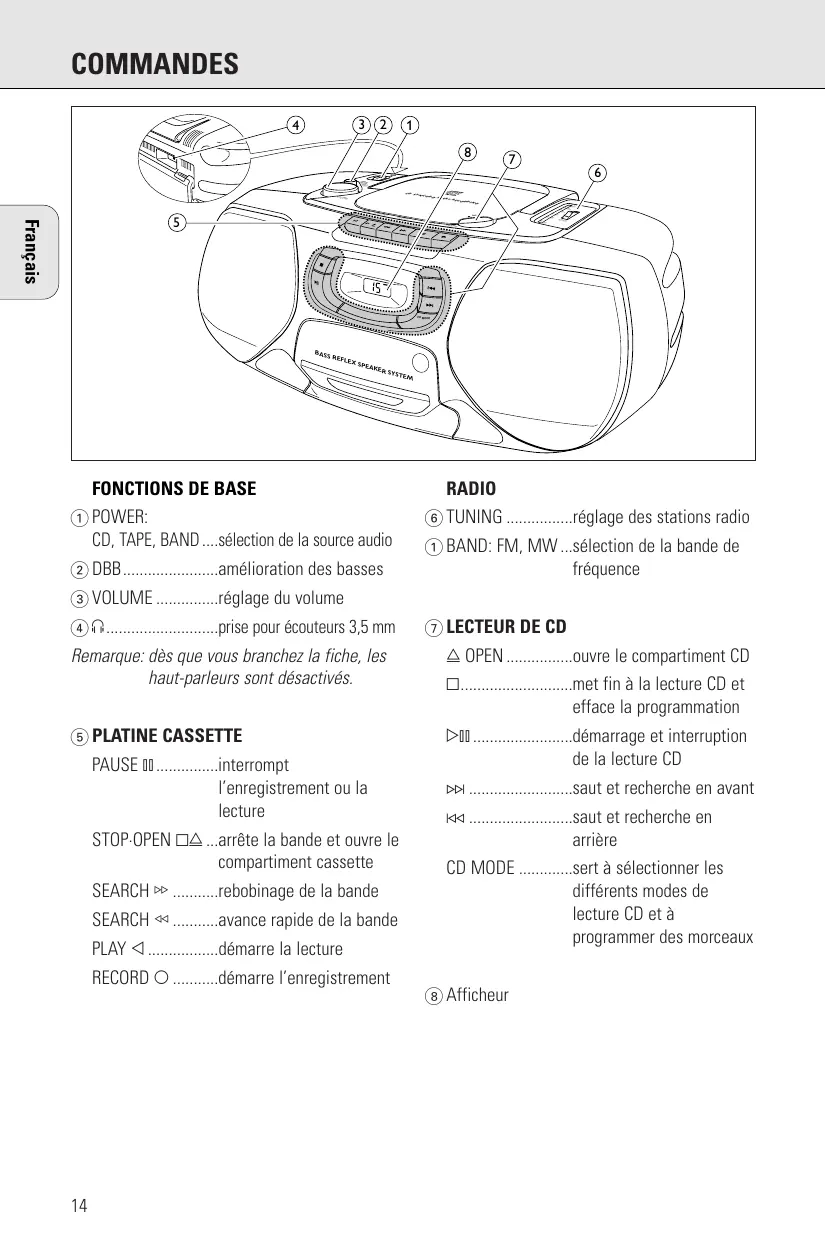 1 POWER: CD, TAPE, BAND ....sélection de la source audio 2 DBB.......................amélioration des basses RADIO 6 TUNING ................réglage des stations radio 1 BAND: FM, MW ...sélection de la bande de fréquence 3 VOLUME ...............réglage du volume 4 p...........................prise pour écouteurs 3,5 mm