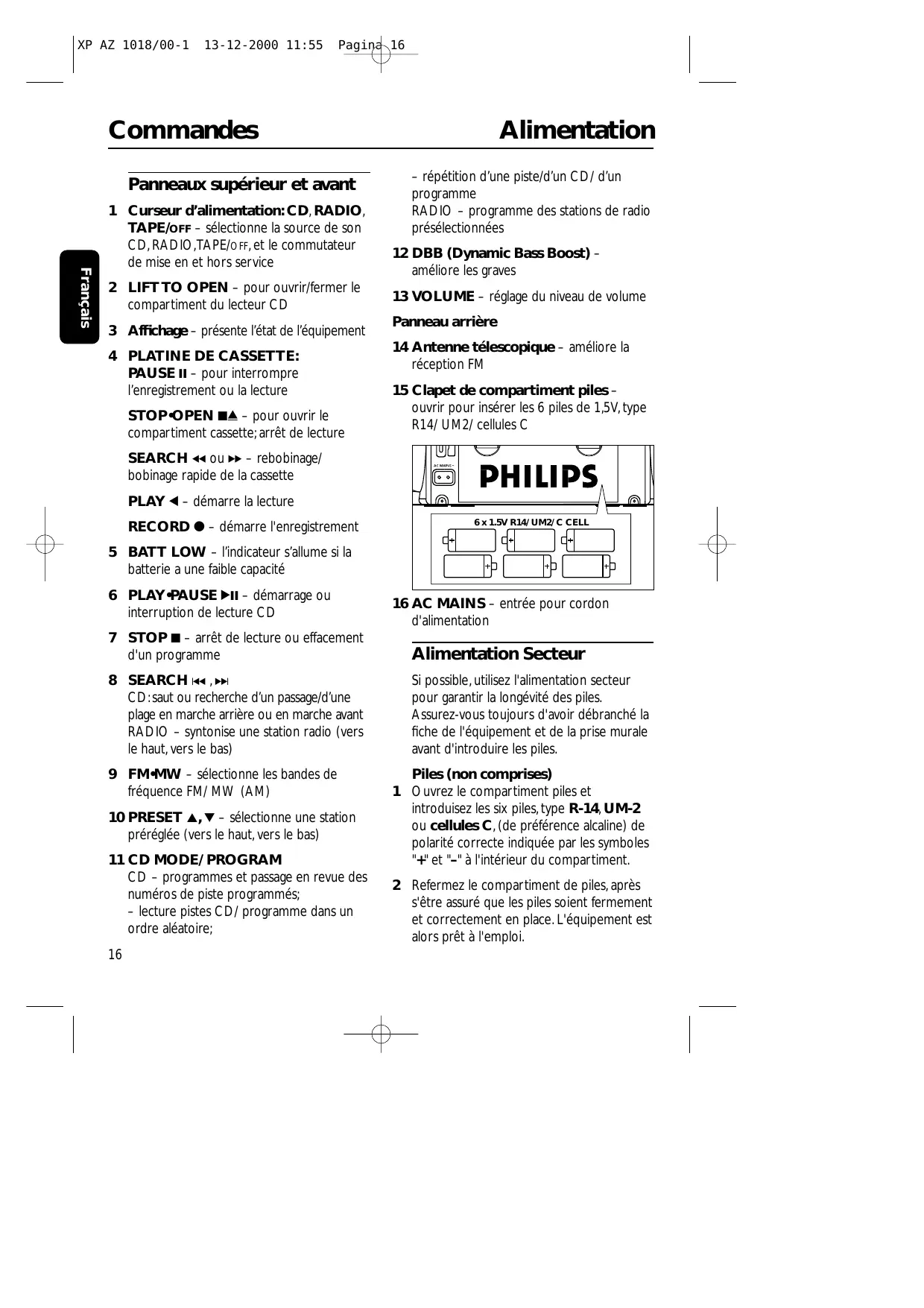 Piles (non comprises) 1 Ouvrez le compartiment piles et introduisez les six piles, type R-14, UM-2 ou cellules C, (de préférence alcaline) de polarité correcte indiquée par les symboles "+" et "–" à l'intérieur du compartiment. 2 Refermez le compartiment de piles, après s'être assuré que les piles soient fermement et correctement en place. L'équipement est alors prêt à l'emploi. XP AZ 1018/00-1 13-12-2000 11:55 Pagina 17 Alimentation Les piles contiennent des produits chimiques, dont elles doivent être rebutées adéquatement. L'emploi incorrect des piles peut causer des fuites électrolytiques et ce faisant, contaminer le compartiment ou causer l'éclatement des dites piles. Pour ce faire, procédez comme suit:
