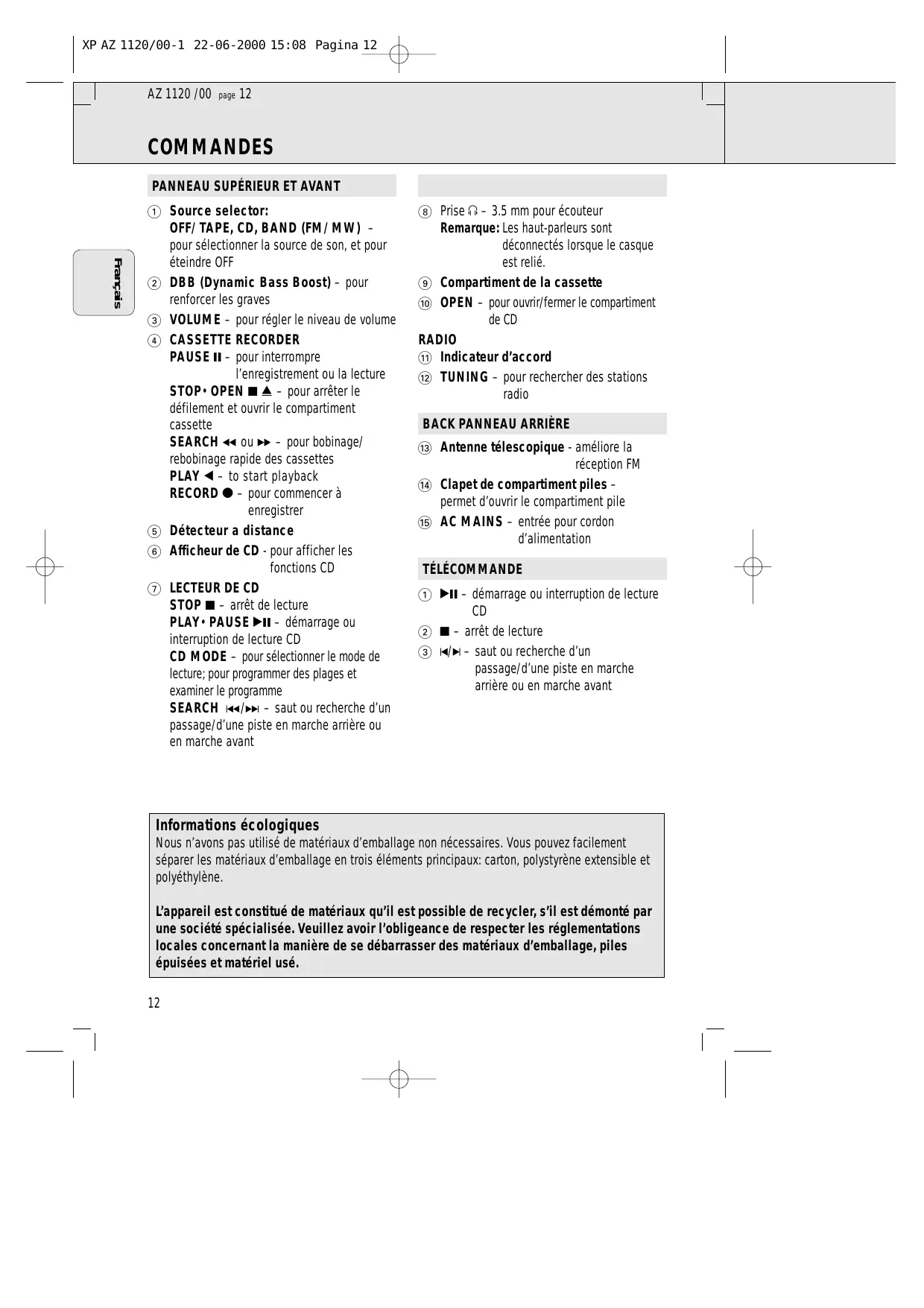 1 2; – démarrage ou interruption de lecture 2 9 – arrêt de lecture 3 J/K – saut ou recherche d’un passage/d’une piste en marche arrière ou en marche avant Informations écologiques Nous n’avons pas utilisé de matériaux d’emballage non nécessaires. Vous pouvez facilement séparer les matériaux d’emballage en trois éléments principaux: carton, polystyrène extensible et polyéthylène. L’appareil est constitué de matériaux qu’il est possible de recycler, s’il est démonté par une société spécialisée. Veuillez avoir l’obligeance de respecter les réglementations locales concernant la manière de se débarrasser des matériaux d’emballage, piles épuisées et matériel usé.