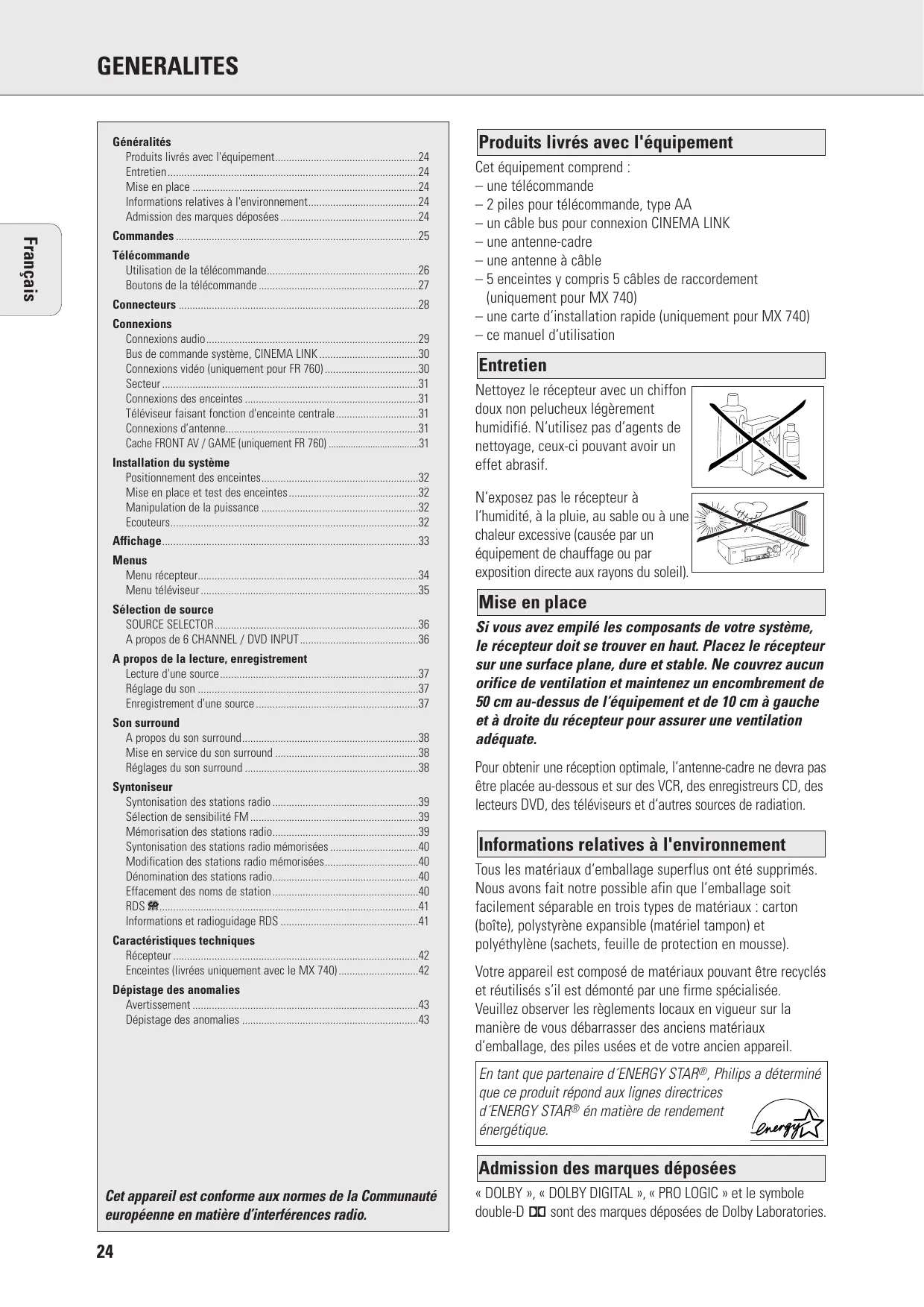 GENERALITES Généralités Produits livrés avec l'équipement24 Entretien24 Mise en place 24 Informations relatives à l'environnement24 Admission des marques déposées 24