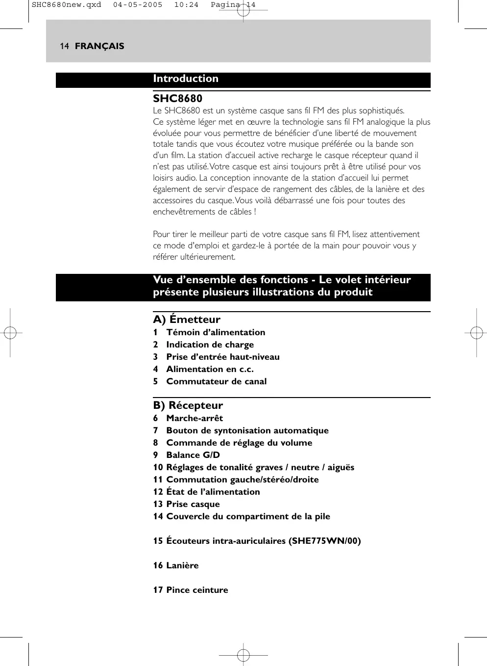 Introduction SHC8680 Le SHC8680 est un système casque sans fil FM des plus sophistiqués. Ce système léger met en œuvre la technologie sans fil FM analogique la plus évoluée pour vous permettre de bénéficier d’une liberté de mouvement totale tandis que vous écoutez votre musique préférée ou la bande son d’un film. La station d’accueil active recharge le casque récepteur quand il n’est pas utilisé.Votre casque est ainsi toujours prêt à être utilisé pour vos loisirs audio. La conception innovante de la station d’accueil lui permet également de servir d’espace de rangement des câbles, de la lanière et des accessoires du casque.Vous voilà débarrassé une fois pour toutes des enchevêtrements de câbles ! Pour tirer le meilleur parti de votre casque sans fil FM, lisez attentivement ce mode d'emploi et gardez-le à portée de la main pour pouvoir vous y référer ultérieurement. Vue d’ensemble des fonctions - Le volet intérieur présente plusieurs illustrations du produit A) Émetteur