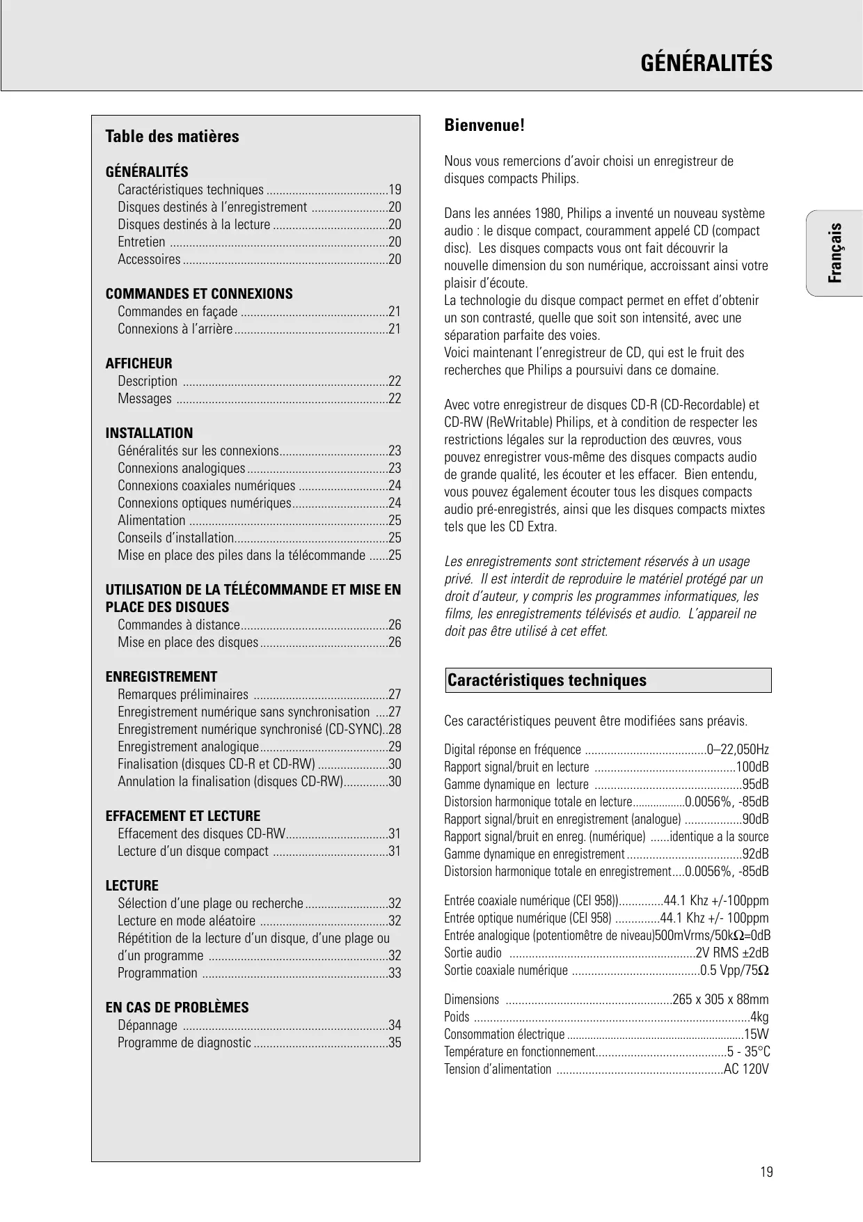 Avec votre enregistrreur de disques CD-R (CD-Recordable) et CD-RW (ReWritable) Philips, et à condition de respecter les restrictions légales sur la reproduction des œuvres, vous pouvez enregistrer vous-même des disques compacts audio de grande qualité, les écouter et les effacer. Bien entendu, vous pouvez également écouter tous les disques compacts audio pré-enregistrrés, ainsi que les disques compacts mixtes tels que les CD Extra.