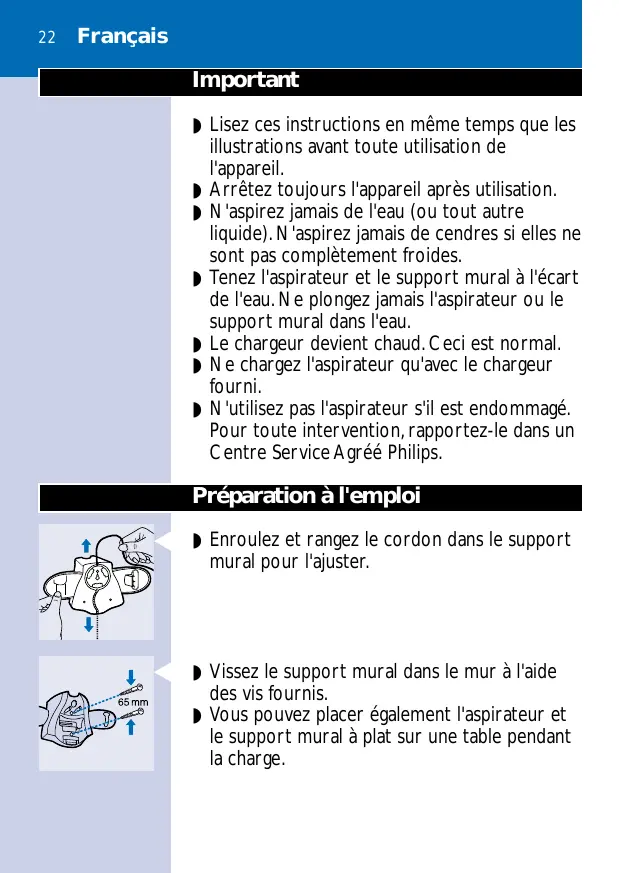 Important ◗ Lisez ces instructions en même temps que les illustrations avant toute utilisation de l'appareil. ◗ Arrêtez toujours l'appareil après utilisation. ◗ N'aspirez jamais de l'eau (ou tout autre liquide). N'aspirez jamais de cendres si elles ne sont pas complètement froides. ◗ Tenez l'aspirateur et le support mural à l'écart de l'eau. Ne plongez jamais l'aspirateur ou le support mural dans l'eau. ◗ Le chargeur devient chaud. Ceci est normal. ◗ Ne chargez l'aspirateur qu'avec le chargeur fourni. ◗ N'utilisez pas l'aspirateur s'il est endommagé. Pour toute intervention, rapportez-le dans un Centre Service Agréé Philips.