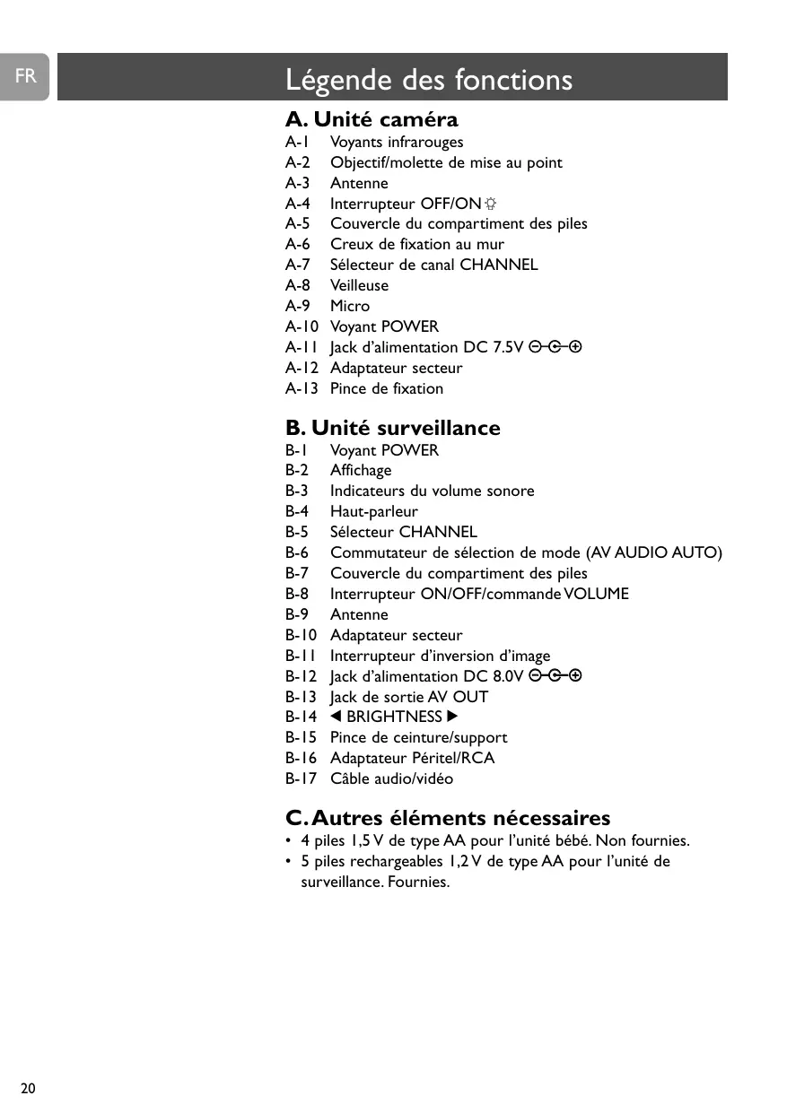 Légende des fonctions Unité caméra (unité bébé) Unité de surveillance (unité parent) Autres éléments nécessaires