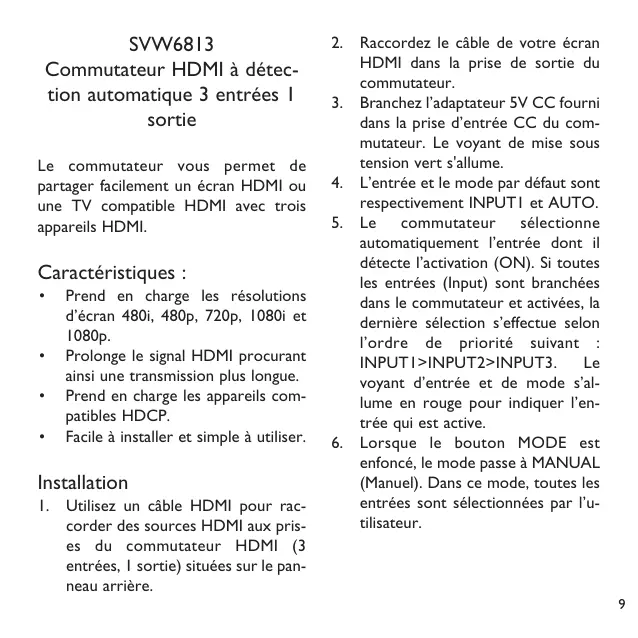 SVW6813 Commutateur HDMI à détection automatique 3 entrées 1 sortie Le commutateur vous permet de partager facilement un écran HDMI ou une TV compatible HDMI avec trois appareils HDMI. Caractéristiques :
