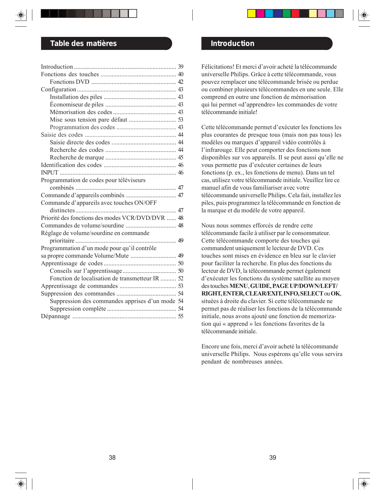 - Dépannage Introduction Félicitations! Et merci d’avoir acheté la télécommande universelle Philips. Grâce à cette télécommande, vous pouvez remplacer une télécommande brisée ou perdue ou combiner plusieurs télécommandes en une seule. Elle comprend en outre une fonction de mémorisation qui lui permet «d’apprendre» les commandes de votre télécommande initiale! Cette télécommande permet d’exécuter les fonctions les plus courantes de presque tous (mais non pas tous) les modèles ou marques d’appareil vidéo contrôlés à l’infrarouge. Elle peut comporter des fonctions non disponibles sur vos appareils. Il se peut aussi qu’elle ne vous permette pas d’exécuter certaines de leurs fonctions (p. ex., les fonctions de menu). Dans un tel cas, utilisez votre télécommande initiale. Veuillez lire ce manuel afin de vous familiariser avec votre télécommande universelle Philips. Cela fait, installez les piles, puis programmez la télécommande en fonction de la marque et du modèle de votre appareil. Nous nous sommes efforcés de rendre cette télécommande facile à utiliser par le consommateur. Cette télécommande comporte des touches qui commandent uniquement le lecteur de DVD. Ces touches sont mises en évidence en bleu sur le clavier pour faciliter la recherche. En plus des fonctions du lecteur de DVD, la télécommande permet également d’exécuter les fonctions du système satellite au moyen des touches MENU, GUIDE, PAGE UP/DOWN/LEFT/ RIGHT, ENTER, CLEAR/EXIT, INFO, SELECT ou OK, situées à droite du clavier. Si cette télécommande ne permet pas de réaliser les fonctions de la télécommande initiale, nous avons ajouté une fonction de memorization qui « apprend » les fonctions favorites de la télécommande initiale. Encore une fois, merci d’avoir acheté la télécommande universelle Philips. Nous espérons qu’elle vous servira pendant de nombreuses années. p. 55
