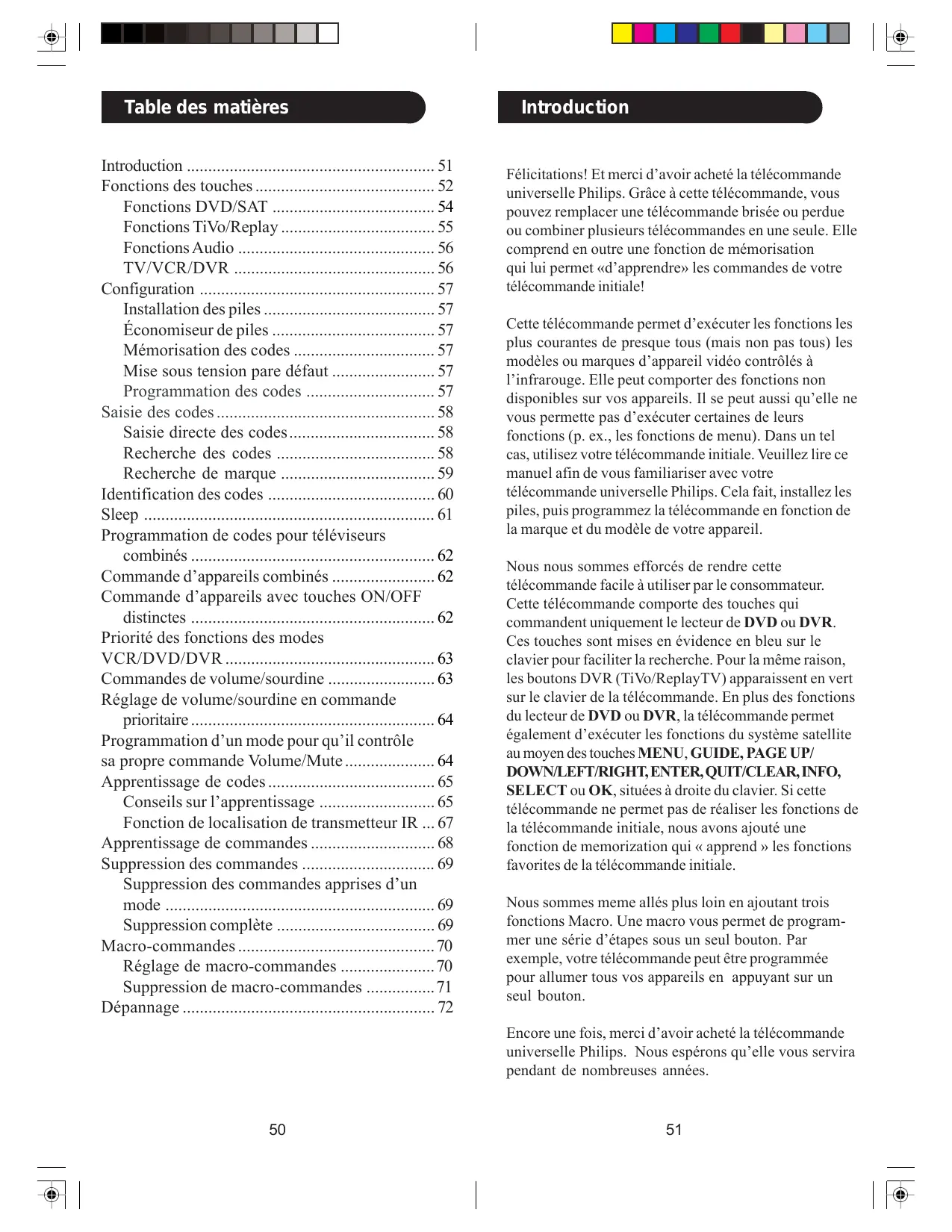 - Dépannage Introduction Félicitations! Et merci d’avoir acheté la télécommande universelle Philips. Grâce à cette télécommande, vous pouvez remplacer une télécommande brisée ou perdue ou combiner plusieurs télécommandes en une seule. Elle comprend en outre une fonction de mémorisation qui lui permet «d’apprendre» les commandes de votre télécommande initiale! Cette télécommande permet d’exécuter les fonctions les plus courantes de presque tous (mais non pas tous) les modèles ou marques d’appareil vidéo contrôlés à l’infrarouge. Elle peut comporter des fonctions non disponibles sur vos appareils. Il se peut aussi qu’elle ne vous permette pas d’exécuter certaines de leurs fonctions (p. ex., les fonctions de menu). Dans un tel cas, utilisez votre télécommande initiale. Veuillez lire ce manuel afin de vous familiariser avec votre télécommande universelle Philips. Cela fait, installez les piles, puis programmez la télécommande en fonction de la marque et du modèle de votre appareil. Nous nous sommes efforcés de rendre cette télécommande facile à utiliser par le consommateur. Cette télécommande comporte des touches qui commandent uniquement le lecteur de DVD ou DVR. Ces touches sont mises en évidence en bleu sur le clavier pour faciliter la recherche. Pour la même raison, les boutons DVR (TiVo/ReplayTV) apparaissent en vert sur le clavier de la télécommande. En plus des fonctions du lecteur de DVD ou DVR, la télécommande permet également d’exécuter les fonctions du système satellite au moyen des touches MENU, GUIDE, PAGE UP/ DOWN/LEFT/RIGHT, ENTER, QUIT/CLEAR, INFO, SELECT ou OK, situées à droite du clavier. Si cette télécommande ne permet pas de réaliser les fonctions de la télécommande initiale, nous avons ajouté une fonction de memorization qui « apprend » les fonctions favorites de la télécommande initiale. Nous sommes meme allés plus loin en ajoutant trois fonctions Macro. Une macro vous permet de programmer une série d’étapes sous un seul bouton. Par exemple, votre télécommande peut être programmée pour allumer tous vos appareils en appuyant sur un seul bouton. Encore une fois, merci d’avoir acheté la télécommande universelle Philips. Nous espérons qu’elle vous servira pendant de nombreuses années. p. 72