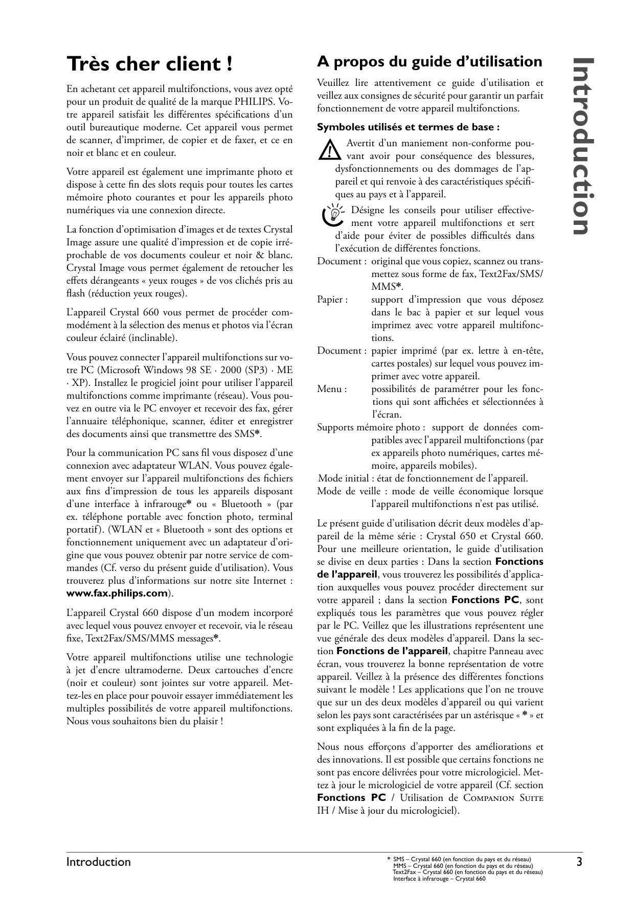- XP). Installez le progiciel joint pour utiliser l’appareil multifonctions comme imprimante (réseau). Vous pouvez en outre via le PC envoyer et recevoir des fax, gérer l’annuaire téléphonique, scanner, éditer et enregistrer des documents ainsi que transmettre des SMS*. Pour la communication PC sans fil vous disposez d’une connexion avec adaptateur WLAN. Vous pouvez également envoyer sur l’appareil multifonctions des fichiers aux fins d’impression de tous les appareils disposant d’une interface à infrarouge* ou « Bluetooth » (par ex. téléphone portable avec fonction photo, terminal portatif ). (WLAN et « Bluetooth » sont des options et fonctionnement uniquement avec un adaptateur d’origine que vous pouvez obtenir par notre service de commandes (Cf. verso du présent guide d’utilisation). Vous trouverez plus d’informations sur notre site Internet : www.fax.philips.com). L’appareil Crystal 660 dispose d’un modem incorporé avec lequel vous pouvez envoyer et recevoir, via le réseau fixe, Text2Fax/SMS/MMS messages*. Votre appareil multifonctions utilise une technologie à jet d’encre ultramoderne. Deux cartouches d’encre (noir et couleur) sont jointes sur votre appareil. Mettez-les en place pour pouvoir essayer immédiatement les multiples possibilités de votre appareil multifonctions. Nous vous souhaitons bien du plaisir ! A propos du guide d’utilisation Veuillez lire attentivement ce guide d’utilisation et veillez aux consignes de sécurité pour garantir un parfait fonctionnement de votre appareil multifonctions. Symboles utilisés et termes de base : Avertit d’un maniement non-conforme pouvant avoir pour conséquence des blessures, dysfonctionnements ou des dommages de l’appareil et qui renvoie à des caractéristiques spécifiques au pays et à l’appareil. Désigne les conseils pour utiliser effectivement votre appareil multifonctions et sert d’aide pour éviter de possibles difficultés dans l’exécution de différentes fonctions. Document : original que vous copiez, scannez ou transmettez sous forme de fax, Text2Fax/SMS/ MMS*. Papier : support d’impression que vous déposez dans le bac à papier et sur lequel vous imprimez avec votre appareil multifonctions. Document : papier imprimé (par ex. lettre à en-tête, cartes postales) sur lequel vous pouvez imprimer avec votre appareil. Menu : possibilités de paramétrer pour les fonctions qui sont affichées et sélectionnées à l’écran. Supports mémoire photo : support de données compatibles avec l’appareil multifonctions (par ex appareils photo numériques, cartes mémoire, appareils mobiles). Mode initial : état de fonctionnement de l’appareil. Mode de veille : mode de veille économique lorsque l’appareil multifonctions n’est pas utilisé.