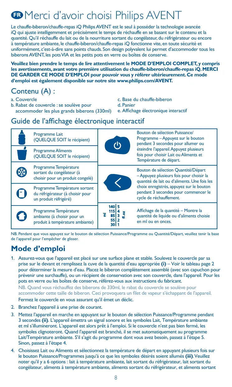 Merci d’avoir choisi Philips AVENT Le chauffe-biberon/chauffe-repas iQ Philips AVENT est le seul à posséder la technologie avancée iQ qui ajuste intelligemment et précisément le temps de réchauffe en se basant sur le contenu et la quantité. Qu’il réchauffe du lait ou de la nourriture sortant du congélateur, du réfrigérateur ou encore à température ambiante, le chauffe-biberon/chauffe-repas iQ fonctionne vite, en toute sécurité et uniformément, c’est-à-dire sans points chauds. Son design polyvalent lui permet d’accommoder tous les biberons AVENT, les pots VIA et les petits pots en verre ou boîtes de conserve. Veuillez bien prendre le temps de lire attentivement le MODE D’EMPLOI COMPLET, y compris les avertissements, avant votre première utilisation du chauffe-biberon/chauffe-repas iQ. MERCI DE GARDER CE MODE D’EMPLOI pour pouvoir vous y référer ultérieurement. Ce mode d’emploi est également disponible sur notre site www.philips.com/AVENT. Contenu (A) : a. Couvercle b. Rabat de couvercle : se soulève pour accommoder les plus grands biberons (330ml) c. Base du chauffe-biberon d. Panier e. Affichage électronique interactif Guide de l’affichage électronique interactif Bouton de sélection Puissance/ Programme – Appuyez sur le bouton pendant 3 secondes pour allumer ou éteindre l’appareil. Appuyez plusieurs fois pour choisir Lait ou Aliments et Température de départ. Programme Lait (QUELQUE SOIT le récipient) Programme Aliments (QUELQUE SOIT le récipient) Programme Température ambiante (à choisir pour un produit à température ambiante)