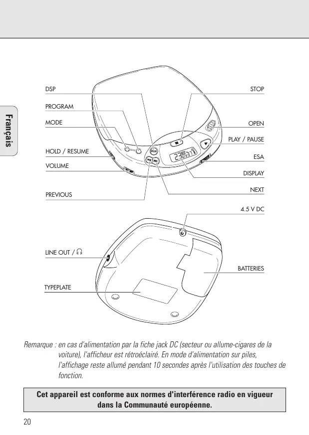 DISPLAY........................(Afficheur) Permet d'afficher les différents modes de fonctionnement, les plages et les durées. § ...................................Touche permettant de sélectionner la plage suivante ou, si maintenue enfoncée, servant à rechercher un passage déterminé du disque. ∞ ...................................Touche permettant de sélectionner la plage précédente ou, si maintenue enfoncée, servant à rechercher un passage déterminé du disque. VOLUME........................Permet de régler le volume à la sortie du casque. RESUME/HOLD ............(reprise/verrouillage) Commutateur servant à activer la fonction RESUME (reprise de lecture) et/ou HOLD (verrouillage de toutes les touches). MODE 0........................Touche de sélection des différents modes de fonctionnement: SHUFFLE™SHUFFLE REPEAT ALL™REPEAT 1™REPEAT ALL ™SCAN™inactive PROG P..........................Touche permettant de mémoriser les plages dans un programme et d'actualiser ce programme. DSP ..............................Digital Sound Processing: touche servant à sélectionner les différentes valeurs de son à la sortie du casque. ROCK™POP™CAR™INCREDIBLE SURROUND™inactive STOP 9..........................Touche permettant d'interrompre la lecture, d'effacer différents réglages, de mettre le lecteur de CD hors circuit et d'activer le chargement. OPEN .............................(ouverture) Coulisseau qui permet d'ouvrir le tiroir du lecteur CD. 2; ..................................Touche permettant de commencer ou d'interrompre la lecture. ESA ................................Electronic Shock Absorption: commutateur permettant d'activer la mémoire tampon électronique afin d'offrir un son sans perturbation. LINE OUT / p ................Prise casque (3,5 mm). 4,5 V DC (CC) ................Prise d'alimentation externe. Compartiment à piles pour recevoir les piles.