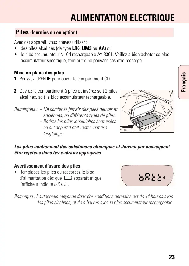 Remarque: L'autonomie moyenne dans des conditions normales est de 14 heures avec des piles alcalines, et de 4 heures avec le bloc accumulator rechargeable.