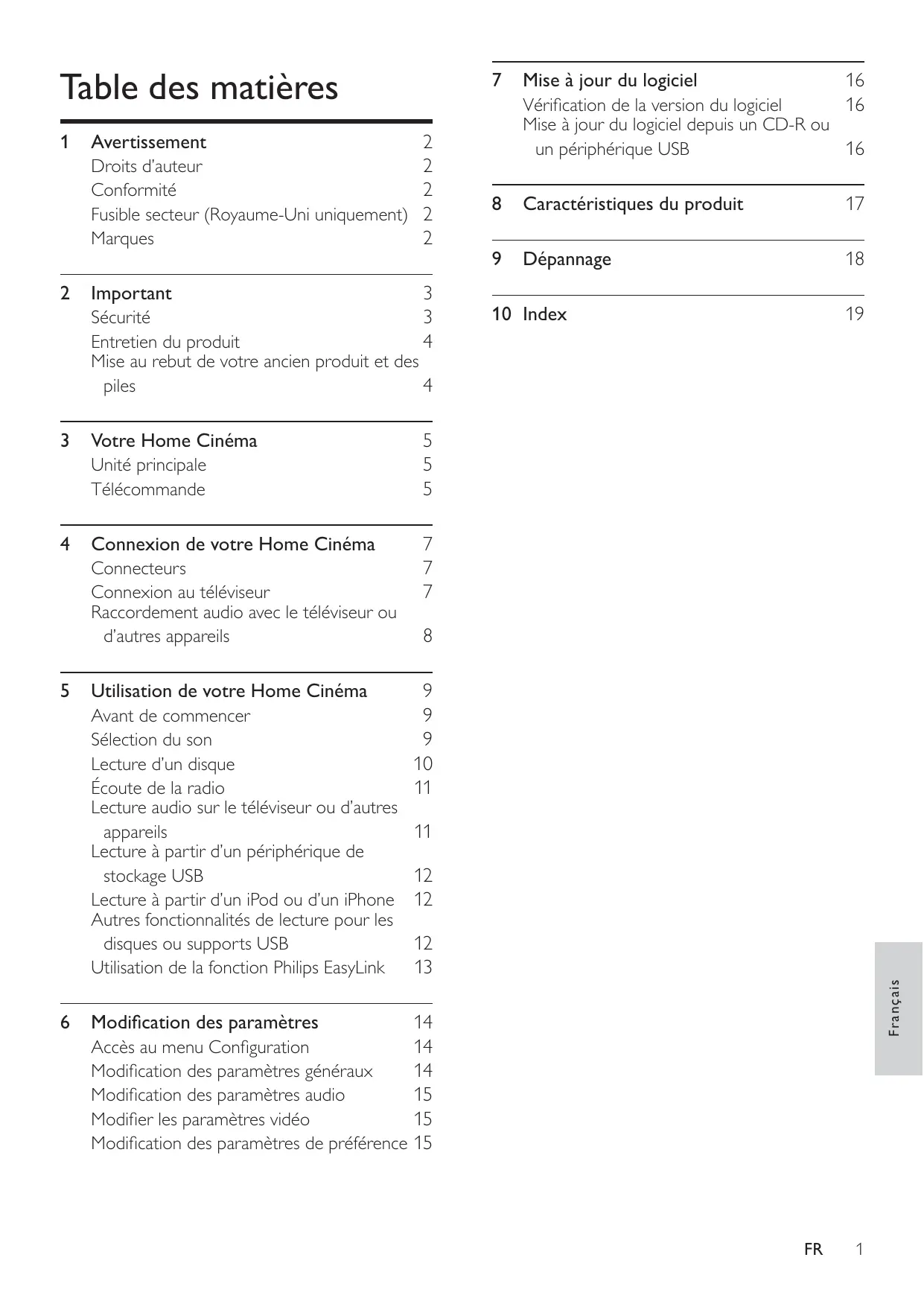 [Réglages préférences]. 3) Sélectionnez [Ss-titre DivX]. 4) Sélectionnez un jeu de caractères pris en charge. 5) Appuyez sur OK . Il est impossible de lire le contenu d’un périphérique de stockage USB. Vériez que le format du périphérique de stockage USB est compatible avec le Home Cinéma (voir ‘Caractéristiques du produit’ à la page 17 ). Assurez-vous que le périphérique de stockage USB est formaté selon un système de chiers pris en charge par le Home Cinéma (NTFS n’est pas pris en charge). Le symbole « sens interdit » ou « x » s’afche à l’écran du téléviseur. Cette opération est impossible. La fonction EasyLink est inopérante. Vériez que le Home Cinéma est raccordé à un téléviseur EasyLink de marque Philips et que la fonction EasyLink est activée . Je ne souhaite pas que mon Home Cinéma s’allume en même temps que mon téléviseur. Il s’agit d’un comportement normal pour Philips EasyLink (HDMI-CEC). Pour que le Home Cinéma fonctionne indépendamment, désactivez la fonction EasyLink . Le contenu vidéo (lms, photos, clips vidéo, etc.) de l’iPod/iPhone ne s’afche pas sur le téléviseur. La navigation des contenus vidéo et photo n’est pas prise en charge. Vous ne pouvez donc parcourir le contenu vidéo et photo que sur l’iPod ou l’iPhone lui-même. Les images de mon iPod/iPhone ne s’afchent pas sur le téléviseur. Branchez un câble composite jaune entre la station d’accueil et le téléviseur. Réglez le téléviseur sur la source AV/VIDEO (correspondant au câble composite jaune). Appuyez sur la touche PLAY de l’iPod ou de l’iPhone pour démarrer le diaporama. 10 Index amplicateur audio connexion langue synchronisation avec la vidéo