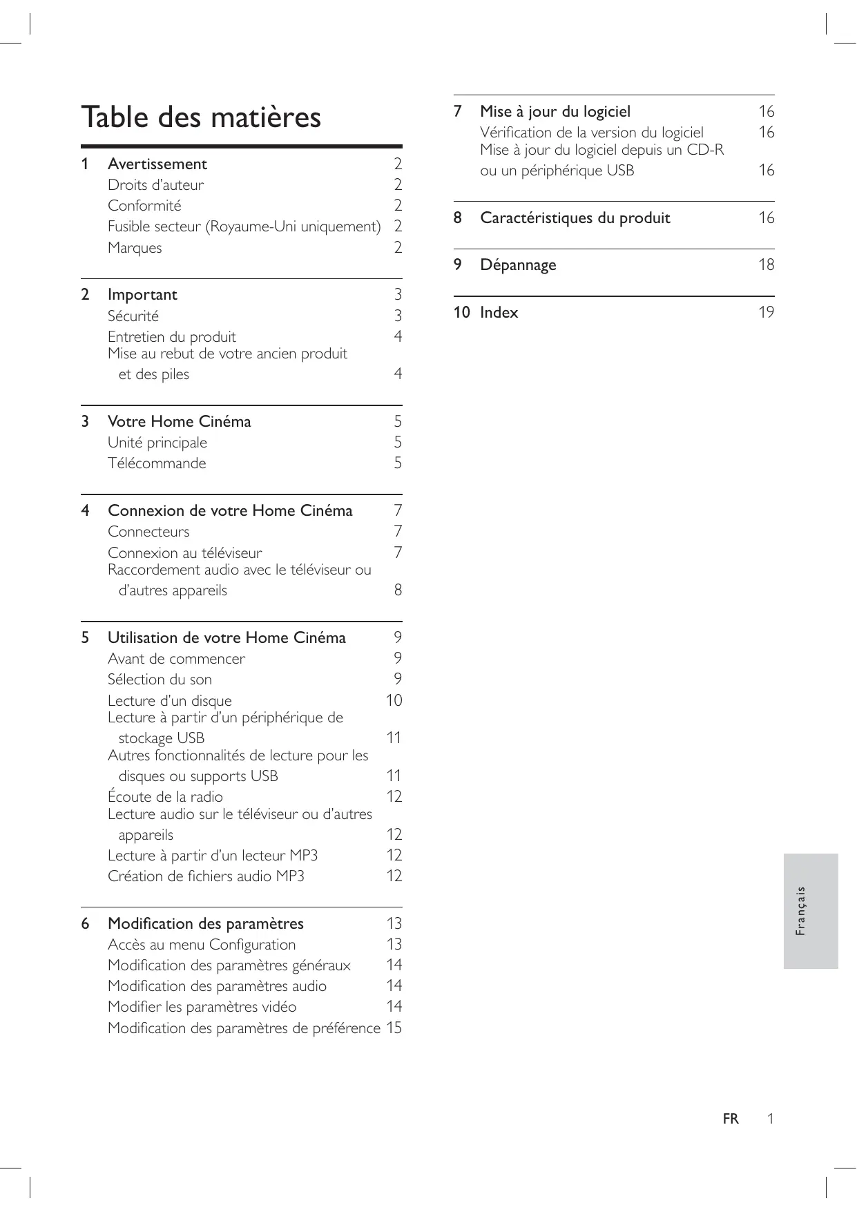 Droits d’auteur Conformité Fusible secteur (Royaume-Uni uniquement) 2 Marques Important Sécurité Entretien du produit Mise au rebut de votre ancien produit et des piles