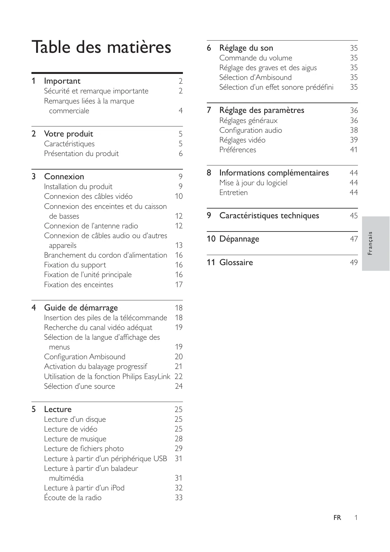 Register your product and get support at www.philips.com/welcome HTS6520 1 Important Sécurité et remarque importante Remarques liées à la marque commerciale 2 Votre produit Caractéristiques Présentation du produit 3 Connexion Installation du produit Connexion des câbles vidéo Connexion des enceintes et du caisson de basses Connexion de l’antenne radio Connexion de câbles audio ou d’autres appareils Branchement du cordon d’alimentation Fixation du support Fixation de l’unité principale Fixation des enceintes 6 Réglage du son