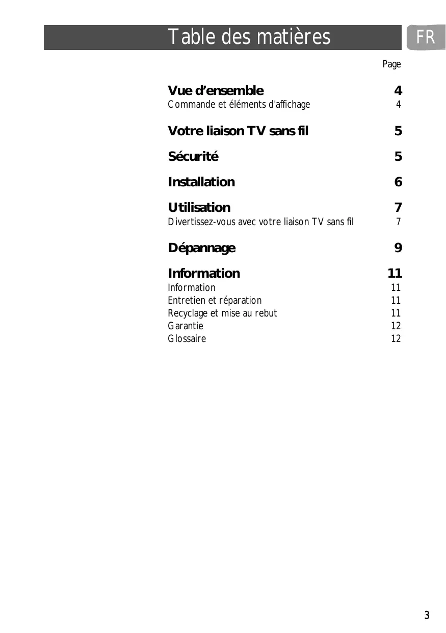 Information Garantie Garantie limitée d'un an Pendant 12 mois à compter de la date d'acquisition, le fabricant répare et remplace tout produit défectueux gratuitement, sur preuve d'achat, dans la mesure où la défaillance n'est pas la conséquence d'une manipulation ou d'un usage inapproprié et si le produit n'a pas été endommagé, soit suite à un accident ou du fait de réparations par un tiers autre que le fabricant. Glossaire CVBS Norme vidéo d'affichage des couleurs sur une télévision. Easylink Offre à un magnétoscope ou à un graveur de DVD la possibilité de suivre automatiquement la programmation prédéfinie de la TV. RCA Connecteurs séparés pour raccorder un appareil audio ou vidéo. Technologie Technologie reposant sur les fréquences radio, utilisée pour les connexions sans fil. SCART Connecteur unique pour faciliter les connexions d'appareils audio et vidéo.