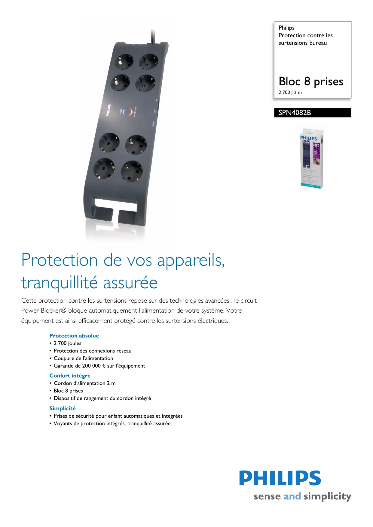 Philips Protection contre les surtensions bureau Bloc 8 prises 2 700 J 2 m SPN4082B Protection de vos appareils, tranquillité assurée Cette protection contre les surtensions repose sur des technologies avancées : le circuit Power Blocker® bloque automatiquement l'alimentation de votre système. Votre équipement est ainsi efficacement protégé contre les surtensions électriques. Protection absolue