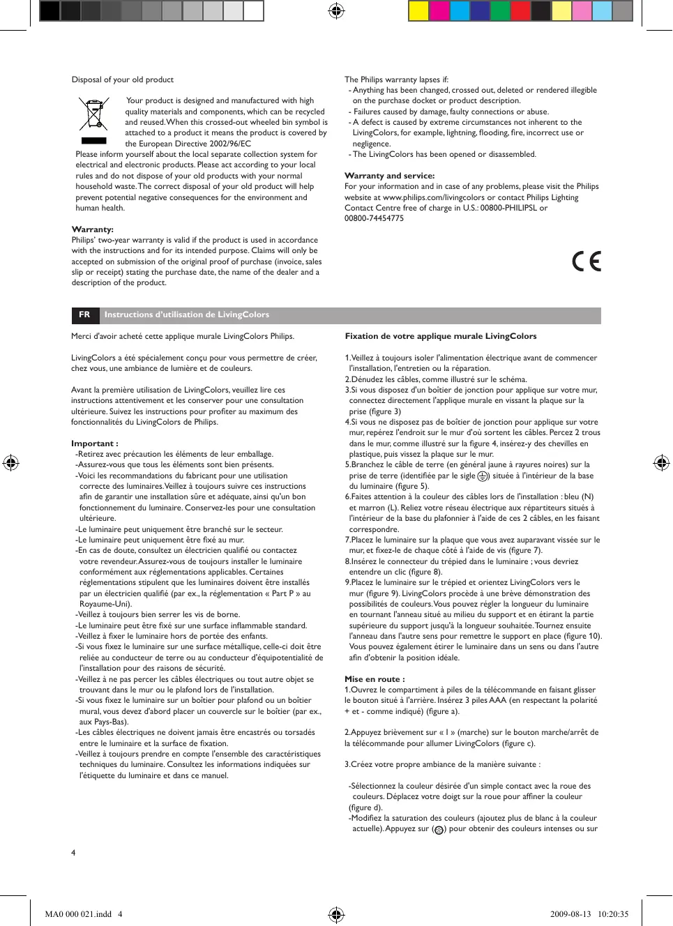The Philips warranty lapses if: - Anything has been changed, crossed out, deleted or rendered illegible on the purchase docket or product description. - Failures caused by damage, faulty connections or abuse. - A defect is caused by extreme circumstances not inherent to the LivingColors, for example, lightning, flooding, fire, incorrect use or negligence. - The LivingColors has been opened or disassembled. Warranty and service: For your information and in case of any problems, please visit the Philips website at www.philips.com/livingcolors or contact Philips Lighting Contact Centre free of charge in U.S.: 00800-PHILIPSL or 00800-74454775 Instructions d’utilisation de LivingColors Merci d'avoir acheté cette applique murale LivingColors Philips. Fixation de votre applique murale LivingColors LivingColors a été spécialement conçu pour vous permettre de créer, chez vous, une ambiance de lumière et de couleurs. 1.Veillez à toujours isoler l'alimentation électrique avant de commencer l'installation, l'entretien ou la réparation. 2.Dénudez les câbles, comme illustré sur le schéma. 3.Si vous disposez d'un boîtier de jonction pour applique sur votre mur, connectez directement l'applique murale en vissant la plaque sur la prise (figure 3) 4.Si vous ne disposez pas de boîtier de jonction pour applique sur votre mur, repérez l'endroit sur le mur d'où sortent les câbles. Percez 2 trous dans le mur, comme illustré sur la figure 4, insérez-y des chevilles en plastique, puis vissez la plaque sur le mur. 5.Branchez le câble de terre (en général jaune à rayures noires) sur la prise de terre (identifiée par le sigle ) située à l'intérieur de la base du luminaire (figure 5). 6.Faites attention à la couleur des câbles lors de l'installation : bleu (N) et marron (L). Reliez votre réseau électrique aux répartiteurs situés à l'intérieur de la base du plafonnier à l'aide de ces 2 câbles, en les faisant correspondre. 7.Placez le luminaire sur la plaque que vous avez auparavant vissée sur le mur, et fixez-le de chaque côté à l'aide de vis (figure 7). 8.Insérez le connecteur du trépied dans le luminaire ; vous devriez entendre un clic (figure 8). 9.Placez le luminaire sur le trépied et orientez LivingColors vers le mur (figure 9). LivingColors procède à une brève démonstration des possibilités de couleurs.Vous pouvez régler la longueur du luminaire en tournant l'anneau situé au milieu du support et en étirant la partie supérieure du support jusqu'à la longueur souhaitée. Tournez ensuite l'anneau dans l'autre sens pour remettre le support en place (figure 10). Vous pouvez également étirer le luminaire dans un sens ou dans l'autre afin d'obtenir la position idéale. Avant la première utilisation de LivingColors, veuillez lire ces instructions attentivement et les conserver pour une consultation ultérieure. Suivez les instructions pour profiter au maximum des fonctionnalités du LivingColors de Philips. Important : -Retirez avec précaution les éléments de leur emballage. -Assurez-vous que tous les éléments sont bien présents. -Voici les recommandations du fabricant pour une utilisation correcte des luminaires.Veillez à toujours suivre ces instructions afin de garantir une installation sûre et adéquate, ainsi qu'un bon fonctionnement du luminaire. Conservez-les pour une consultation ultérieure. -Le luminaire peut uniquement être branché sur le secteur. -Le luminaire peut uniquement être fixé au mur. -En cas de doute, consultez un électricien qualifié ou contactez votre revendeur. Assurez-vous de toujours installer le luminaire conformément aux réglementations applicables. Certaines réglementations stipulent que les luminaires doivent être installés par un électricien qualifié (par ex., la réglementation « Part P » au Royaume-Uni). -Veillez à toujours bien serrer les vis de borne. -Le luminaire peut être fixé sur une surface inflammable standard. -Veillez à fixer le luminaire hors de portée des enfants. -Si vous fixez le luminaire sur une surface métallique, celle-ci doit être reliée au conducteur de terre ou au conducteur d'équipotentialité de l'installation pour des raisons de sécurité. -Veillez à ne pas percer les câbles électriques ou tout autre objet se trouvant dans le mur ou le plafond lors de l'installation. -Si vous fixez le luminaire sur un boîtier pour plafond ou un boîtier mural, vous devez d'abord placer un couvercle sur le boîtier (par ex., aux Pays-Bas). -Les câbles électriques ne doivent jamais être encastrés ou torsadés entre le luminaire et la surface de fixation. -Veillez à toujours prendre en compte l'ensemble des caractéristiques techniques du luminaire. Consultez les informations indiquées sur l'étiquette du luminaire et dans ce manuel. Mise en route : 1.Ouvrez le compartiment à piles de la télécommande en faisant glisser le bouton situé à l'arrière. Insérez 3 piles AAA (en respectant la polarité + et - comme indiqué) (figure a). 2.Appuyez brièvement sur « I » (marche) sur le bouton marche/arrêt de la télécommande pour allumer LivingColors (figure c). 3.Créez votre propre ambiance de la manière suivante : -Sélectionnez la couleur désirée d'un simple contact avec la roue des couleurs. Déplacez votre doigt sur la roue pour affiner la couleur (figure d). -Modifiez la saturation des couleurs (ajoutez plus de blanc à la couleur actuelle). Appuyez sur ( ) pour obtenir des couleurs intenses ou sur