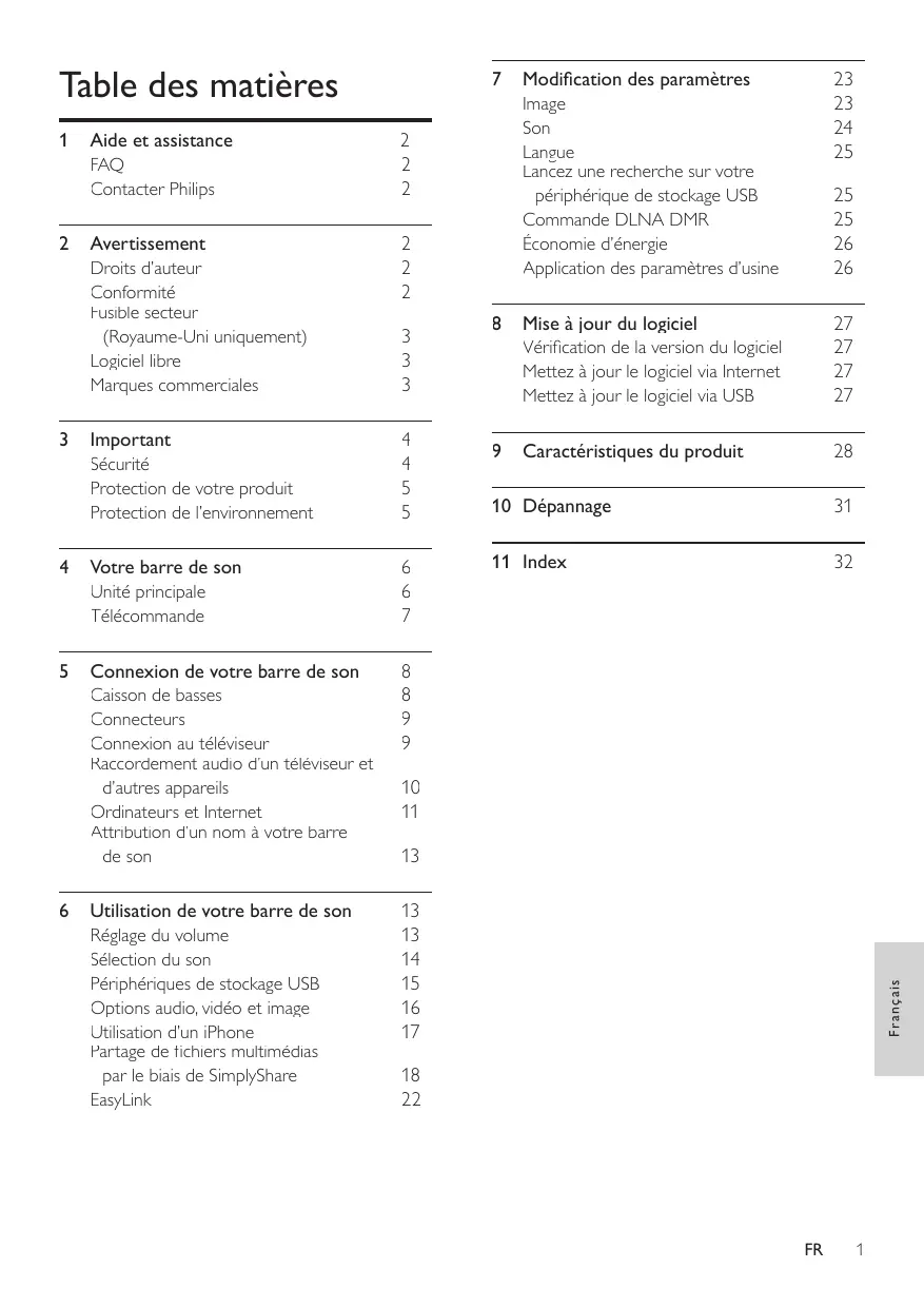 Avertissement Cette section contient les mentions légales et les notifications de marque commerciale. Droits d’auteur FAQ Pour tout problème, reportez-vous aux questions fréquentes (FAQ) correspondant à cette barre de son sur www.philips.com/support. Si vous avez toujours besoin d’aide, contactez le Service Consommateurs Philips de votre pays. Avertissement