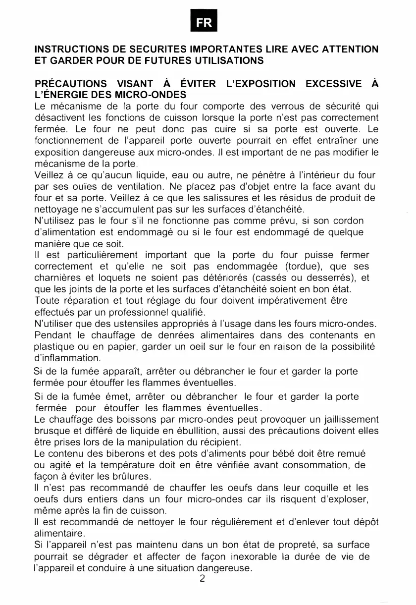fonctionnement de l'appareil porte ouverte pourrait en effet entraîner une exposition dangereuse aux micro-ondes. Il est important de ne pas modifier le mécanisme de la porte. Veillez à ce qu'aucun liquide, eau ou autre, ne pénètre à l'intérieur du four par ses ouïes de ventilation. Ne placez pas d'objet entre la face avant du four et sa porte. Veillez à ce que les salissures et les résidus de produit de nettoyage ne s'accumulent pas sur les surfaces d'étanchéité. N'utilisez pas le four s'il ne fonctionne pas comme prévu, si son cordon d'alimentation est endommagé ou si le four est endommagé de quelque manière que ce soit. Il est particulièrement important que la porte du four puisse fermer correctement et qu'elle ne soit pas endommagée (tordue), que ses charnières et loquets ne soient pas détériorés (cassés ou desserrés), et que les joints de la porte et les surfaces d'étanchéité soient en bon état. Toute réparation et tout réglage du four doivent impérativement être effectués par un professionnel qualifié. N'utiliser que des ustensiles appropriés à l'usage dans les fours micro-ondes. Pendant le chauffage de denrées alimentaires dans des contenants en plastique ou en papier, garder un oeil sur le four en raison de la possibilité d'inflammation. Si de la fumée apparaît, arrêter ou débrancher le four et garder la porte fermée pour étouffer les flammes éventuelles. Si de la fumée émet, arrêter ou débrancher le four et garder la porte fermée pour étouffer les flammes éventuelles . Le chauffage des boissons par micro-ondes peut provoquer un jaillissement brusque et différé de liquide en ébullition, aussi des précautions doivent elles être prises lors de la manipulation du récipient. Le contenu des biberons et des pots d'aliments pour bébé doit être remué ou agité et la température doit en être vérifiée avant consommation, de façon à éviter les brûlures. Il n'est pas recommandé de chauffer les oeufs dans leur coquille et les oeufs durs entiers dans un four micro-ondes car ils risquent d'exploser, même après la fin de cuisson. Il est recommandé de nettoyer le four régulièrement et d'enlever tout dépôt alimentaire. Si l'appareil n'est pas maintenu dans un bon état de propreté, sa surface pourrait se dégrader et affecter de façon inexorable la durée de vie de l'appareil et conduire à une situation dangereuse.