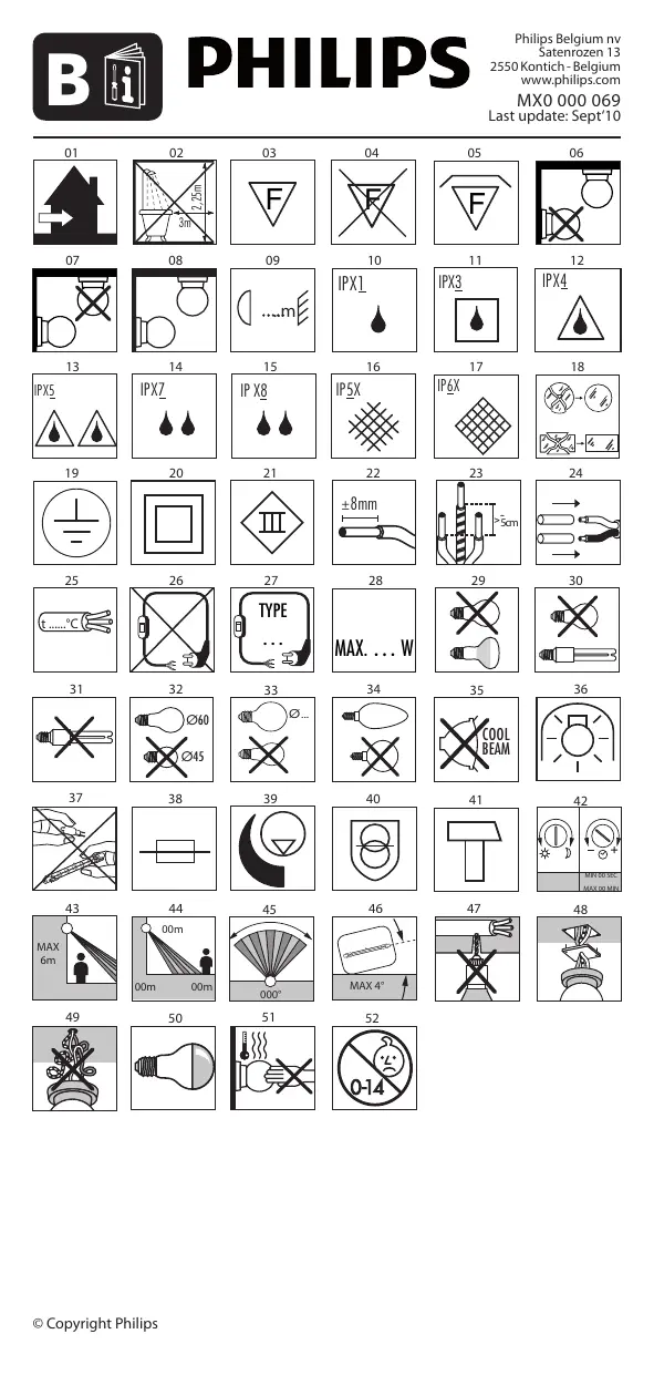 • Si vous avez un doute, demandez conseil à un électricien ou au vendeur. Assurez vous que vous installez toujours les articles suivant la réglementation en vigueur. Certaines règlementations imposent l’installation de certains articles par un électricien qualifié. (ex. en Allemagne). • Serrez toujours fermement les écrous de fixation, plus spécialement les attaches pour les équipements en très basse tension (12V). • Vérifiez la bonne couleur des câbles de branchement. Bleu: neutre (N). Brun ou noir (L): positif, et si l’article est en classe I: vert et jaune pour la terre. • Installer les appliques hors de la portée des enfants • Si le luminaire est installé sur une surface métallique, celle-ci doit être reliée au fil de terre ou à une liaison équipotentielle de l'installation. • Le nettoyage des articles d’éclairage se fait avec un chiffon sec, n’utilisez pas de solvants ou de produits abrasifs. Evitez les projections de liquides sur les parties électriques. • Prenez toujours en compte les spécifications techniques de l’équipement. Vérifiez les icônes sur l’étiquette argentée de l’article et les icônes que nous vous expliquons sur la partie A de votre notice de sécurité. • Mise au rebut des produits en fin de vie: Ce produit a été conçu et fabriqué avec des matériaux et composants recyclables de haute qualité. Le symbole d'une poubelle barrée apposé sur un produit signifie que ce dernier répond aux exigences de la directive européenne 2002/96/EC. Informez-vous auprès des instances locales sur le système de collecte des produits électriques et électroniques en fin de vie. Conformez-vous à la législation en vigueur et ne jetez pas vos produits avec les déchets ménagers. Seule une mise au rebut adéquate des produits peut empêcher la contamination de l'environnement et ses effets nocifs sur la santé. ATTENTION: vous trouverez ci-après toutes les explications avec des références numériques correspondant respectivement aux instructions de sécurité. 01- Installation intérieure seulement 02- L’équipement ne convient pas pour une installation dans les salles de bains (au moins pas dans les zones spécifiées). 03- L’équipement peut être installé sur des surfaces normalement inflammables.Les luminaires encastrés ne doivent en aucune manière être recouverts de matériaux isolants ou assimilés. 04- Ce produit n'est pas adapté pour un montage direct sur des surfaces inflammables. 05- L'article peut être recouvert de matériaux isolants. 06- L’équipement ne peut être fixé que sur un plafond. 07- L’équipement n’est fixable qu’au mur. 08- L'article est prévu pour être accroché au mur ou au plafond. 09- Respectez toujours la distance minimale entre la lampe et les objets éclairés comme indiqué sur l’icône. 10- IPX1 : L'article est protégé contre les chuttes d'eau verticales. 11- IPX3 : l’équipement peut être exposé à la pluie (gouttes de pluie tombant dans un angle de 60° maximum par rapport à l’axe). 12- IPX4 : L’équipement est résistant aux projections d’eau: il peut être exposé à toute projection d’eau venant de n’importe quelle direction (360°). 13- IPX5 : L'article est protégé contre les jets d'eau. 14- IPX7 : Protection partielle contre l'immersion (jusqu'à 1mètre) 15- IPX8 : Offre une protection contre l’immersion jusqu’à la profondeur indiquée. 16- IP5X : L'article est protégé contre les poussières. 17- IP6X : L'article est étanche aux poussières. 18- Remplacez immédiatement un verre de sécurité fissuré ou cassé et n’utilisez que des éléments approuvés par le constructeur. 19- Protection de classe I : l'équpement a une connexion à la prise de terre. Le câble de terre (jaune et vert) doit être connecté au clip marqué du symbole . 20- Protection de classe II: l’équipement a une double protection et ne doit pas être connecté à la prise de terre. 21- Protection de classe III: L’équipement n’est prévu que pour des articles de très basse tension (12V). 22- Installer les fils comme indiqué sur le schéma. 23- Le câble de terre doit toujours être plus long que les câbles de contact. 24- L’utilisation d’un matériau supplémentaire pour protéger de la chaleur est requis sur les câbles non protégés. 25- Utilisez le câble calorifo-résistant pour faire l’installation secteur. 26- L’équipement n’est prévu que pour un branchement direct au réseau. 27- X-connection : en cas de dommages, effectuer le remplacement par le même câble. Y-connection : en cas de dommages du câble, il doit être remplacé par le fabricant, son service après vente ou une personne de qualification similaire afin d'éviter tout danger. Z-connexion : Le câble ne peut faire l’objet d’un remplacement 28- MAX. …W: n’utilisez pas d’ampoule d’une puissance supérieure à celle indiquée sur l’étiquette du produit. 29- L’équipement ne convient qu’à des ampoules avec réflecteurs. 30- Seule les ampoules PLCE peuvent être utilisées dans cet équipement. 31- Vous ne pouvez pas mettre d’ampoule PLCE dans cet article. 32- Seule une lampe incandescente de diamètre 60 mm peut être utilisée pour cet article. Une lampe de 45 mm ne peut l’être. 33- Utiliser uniquement une ampoule à incandescence de la taille indiquée. Ne jamais utiliser une ampoule à incandescence standard. 34- Ce produit est uniquement adapté pour les ampoules de forme flamme. 35- Ne jamais utiliser d’ampoule à faisceaux froids. 36- Ne conviennent pour cette installation que les lampes de type protection incorporée ou à faible tension. Une protection supplémentaire en verre n’est pas nécessaire. 37- Les ampoules bispina et barrettes halogènes ne doivent pas êtres touchées à mains nues. 38- Ce luminiare est équipé d'un fusible. Dans le cas où le luminaire ne fonctionne toujours pas après changement de l'ampoule, le fus